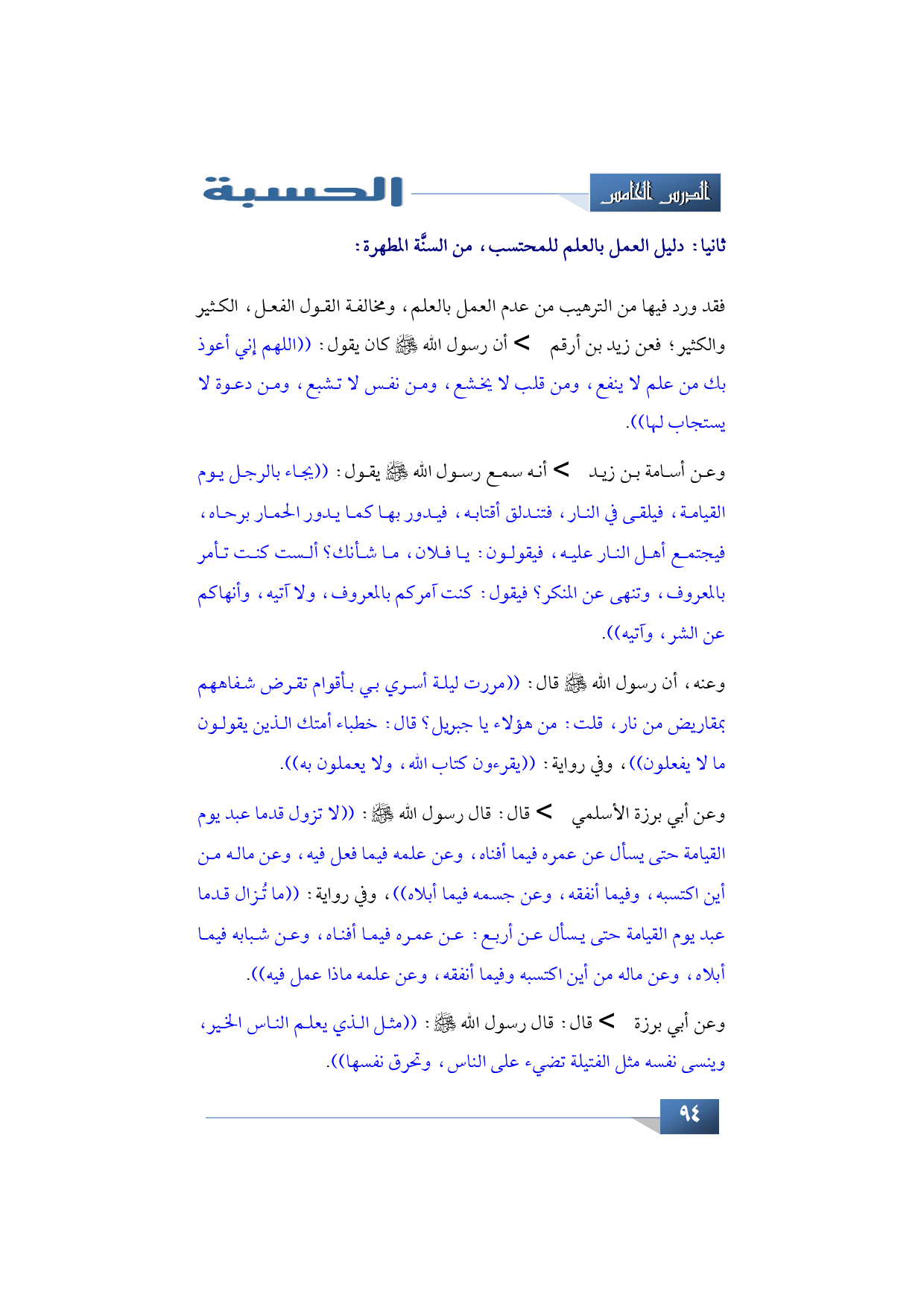 وعن أبي برزة الأسلمي -رضي الله عنه- قال: قال رسول الله -صلى الله عليه وسلم-: ((لا تزول قدما عبد يوم القيامة حتى يسأل عن عمره فيما أفناه، وعن علمه فيما فعل فيه، وعن ماله من أين اكتسبه، وفيما أنفقه، وعن جسمه فيما أبلاه))، وفي رواية: ((ما تُزال قدما عبد يوم القيامة حتى يسأل عن أربع: عن عمره فيما أفناه، وعن شبابه فيما أبلاه، وعن ماله من أين اكتسبه وفيما أنفقه، وعن علمه ماذا عمل فيه)).