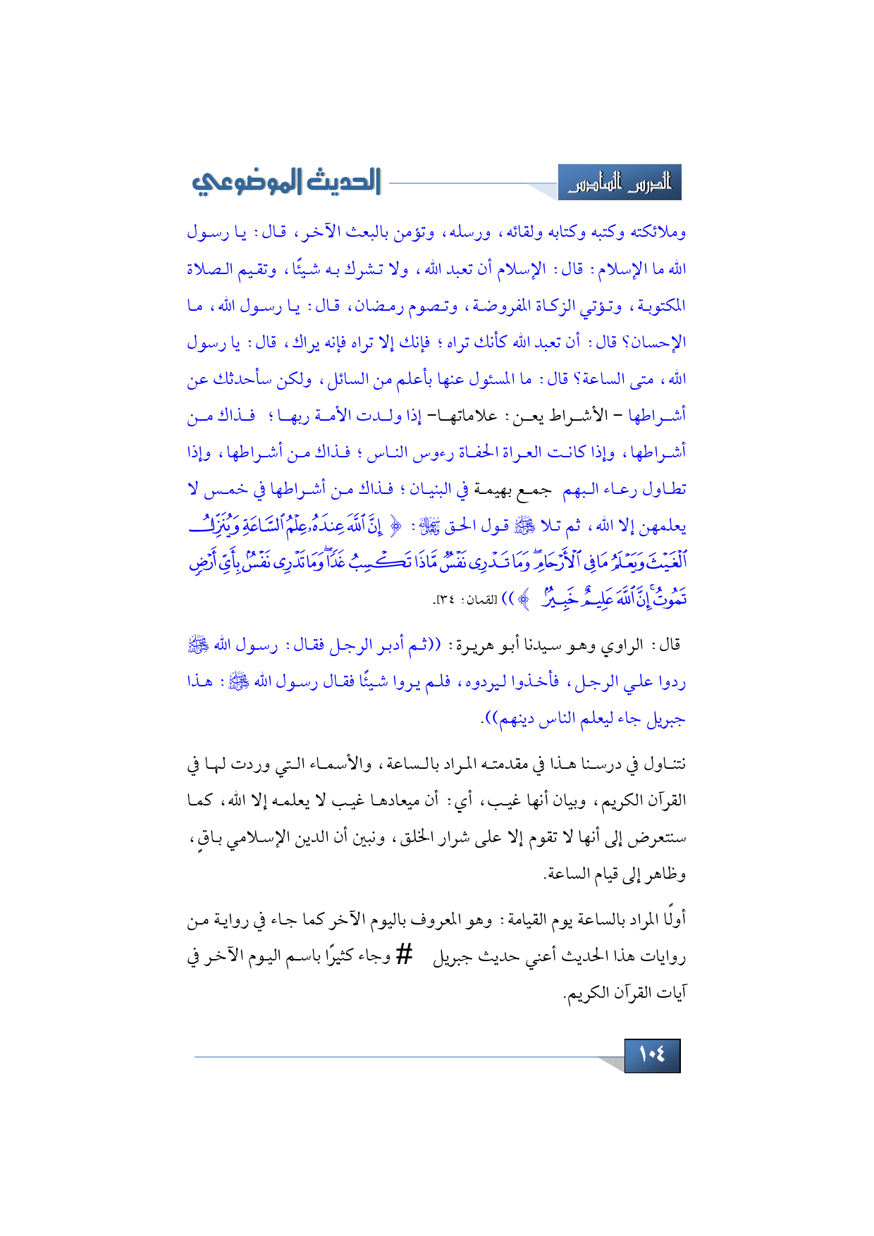وملائكته وكتبه وكتابه ولقائه، ورسله، وتؤمن بالبعث الآخر، قال: يا رسول الله ما الإسلام: قال: الإسلام أن تعبد الله، ولا تشرك به شيئًا، وتقيم الصلاة المكتوبة، وتؤتي الزكاة المفروضة، وتصوم رمضان، قال: يا رسول الله، ما الإحسان؟ قال: أن تعبد الله كأنك تراه؛ فإنك إلا تراه فإنه يراك، قال: يا رسول الله، متى الساعة؟ قال: ما المسئول عنها بأعلم من السائل، ولكن سأحدثك عن أشراطها - الأشراط يعن: علاماتها- إذا ولدت الأمة ربها؛ فذاك من أشراطها، وإذا كانت العراة الحفاة رءوس الناس؛ فذاك من أشراطها، وإذا تطاول رعاء البهم جمع بهيمة في البنيان؛ فذاك من أشراطها في خمس لا يعلمهن إلا الله، ثم تلا -صلى الله عليه وسلم- قول الحق -سبحانه وتعالى-: {إِنَّ اللَّهَ عِنْدَهُ عِلْمُ السَّاعَةِ وَيُنَزِّلُ الْغَيْثَ وَيَعْلَمُ مَا فِي الأَرْحَامِ وَمَا تَدْرِي نَفْسٌ مَاذَا تَكْسِبُ غَدًا وَمَا تَدْرِي نَفْسٌ بِأَيِّ أَرْضٍ تَمُوتُ إِنَّ اللَّهَ عَلِيمٌ خَبِيرٌ} (لقمان: 34).