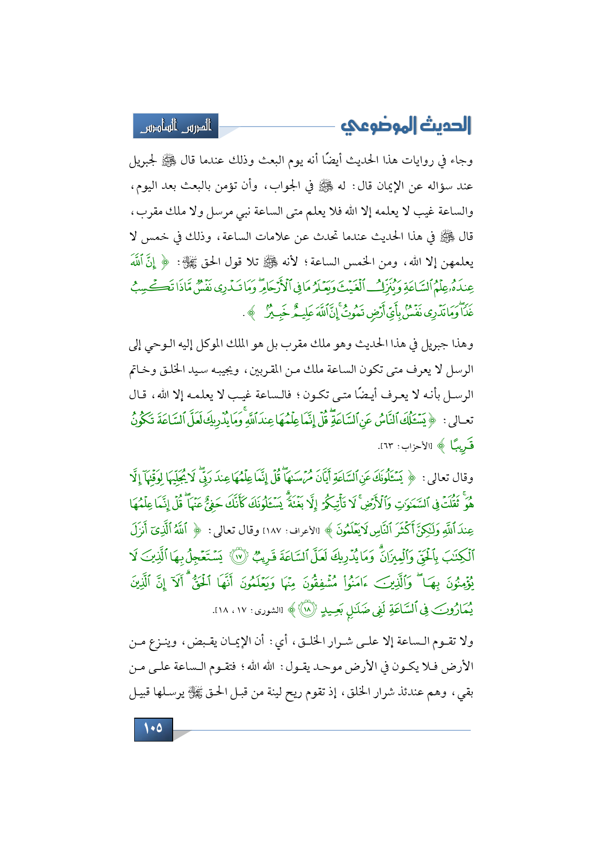 وجاء في روايات هذا الحديث أيضًا أنه يوم البعث وذلك عندما قال -صلى الله عليه وسلم- لجبريل عند سؤاله عن الإيمان قال: له -عليه الصلاة والسلام- في الجواب، وأن تؤمن بالبعث بعد اليوم، والساعة غيب لا يعلمه إلا الله فلا يعلم متى الساعة نبي مرسل ولا ملك مقرب، قال -صلى الله عليه وسلم- في هذا الحديث عندما تحدث عن علامات الساعة، وذلك في خمس لا يعلمهن إلا الله، ومن الخمس الساعة؛ لأنه -صلى الله عليه وسلم- تلا قول الحق -سبحانه وتعالى-: {إِنَّ اللَّهَ عِنْدَهُ عِلْمُ السَّاعَةِ وَيُنَزِّلُ الْغَيْثَ وَيَعْلَمُ مَا فِي الأَرْحَامِ وَمَا تَدْرِي نَفْسٌ مَاذَا تَكْسِبُ غَدًا وَمَا تَدْرِي نَفْسٌ بِأَيِّ أَرْضٍ تَمُوتُ إِنَّ اللَّهَ عَلِيمٌ خَبِيرٌ}.