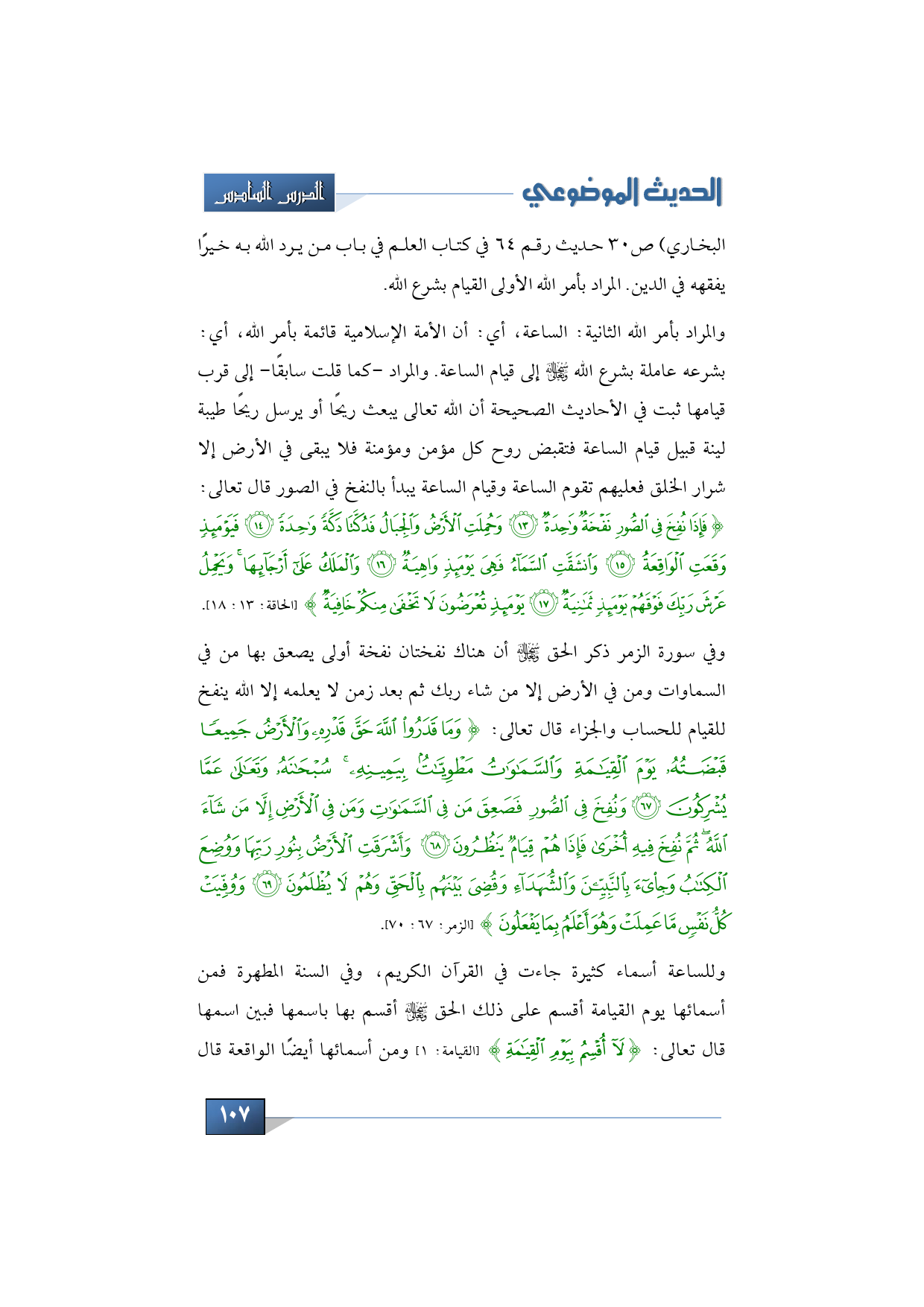 والمراد بأمر الله الثانية: الساعة، أي: أن الأمة الإسلامية قائمة بأمر الله، أي: بشرعه عاملة بشرع الله -سبحانه وتعالى- إلى قيام الساعة. والمراد -كما قلت سابقًا- إلى قرب قيامها ثبت في الأحاديث الصحيحة أن الله تعالى يبعث ريحًا أو يرسل ريحًا طيبة لينة قبيل قيام الساعة فتقبض روح كل مؤمن ومؤمنة فلا يبقى في الأرض إلا شرار الخلق فعليهم تقوم الساعة وقيام الساعة يبدأ بالنفخ في الصور قال تعالى: {فَإِذَا نُفِخَ فِي الصُّورِ نَفْخَةٌ وَاحِدَةٌ * وَحُمِلَتْ الأَرْضُ وَالْجِبَالُ فَدُكَّتَا دَكَّةً وَاحِدَةً * فَيَوْمَئِذٍ وَقَعَتْ الْوَاقِعَةُ * وَانشَقَّتْ السَّمَاءُ فَهِيَ يَوْمَئِذٍ وَاهِيَةٌ * وَالْمَلَكُ عَلَى أَرْجَائِهَا وَيَحْمِلُ عَرْشَ رَبِّكَ فَوْقَهُمْ يَوْمَئِذٍ ثَمَانِيَةٌ * يَوْمَئِذٍ تُعْرَضُونَ لا تَخْفَى مِنْكُمْ خَافِيَةٌ} (الحاقة: 13: 18).