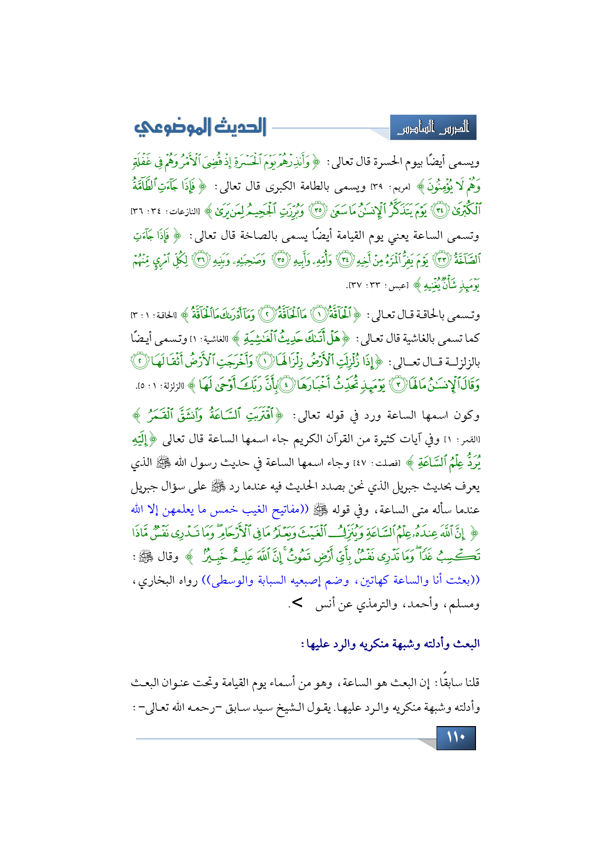 قلنا سابقًا: إن البعث هو الساعة، وهو من أسماء يوم القيامة وتحت عنوان البعث وأدلته وشبهة منكريه والرد عليها. يقول الشيخ سيد سابق -رحمه الله تعالى-: