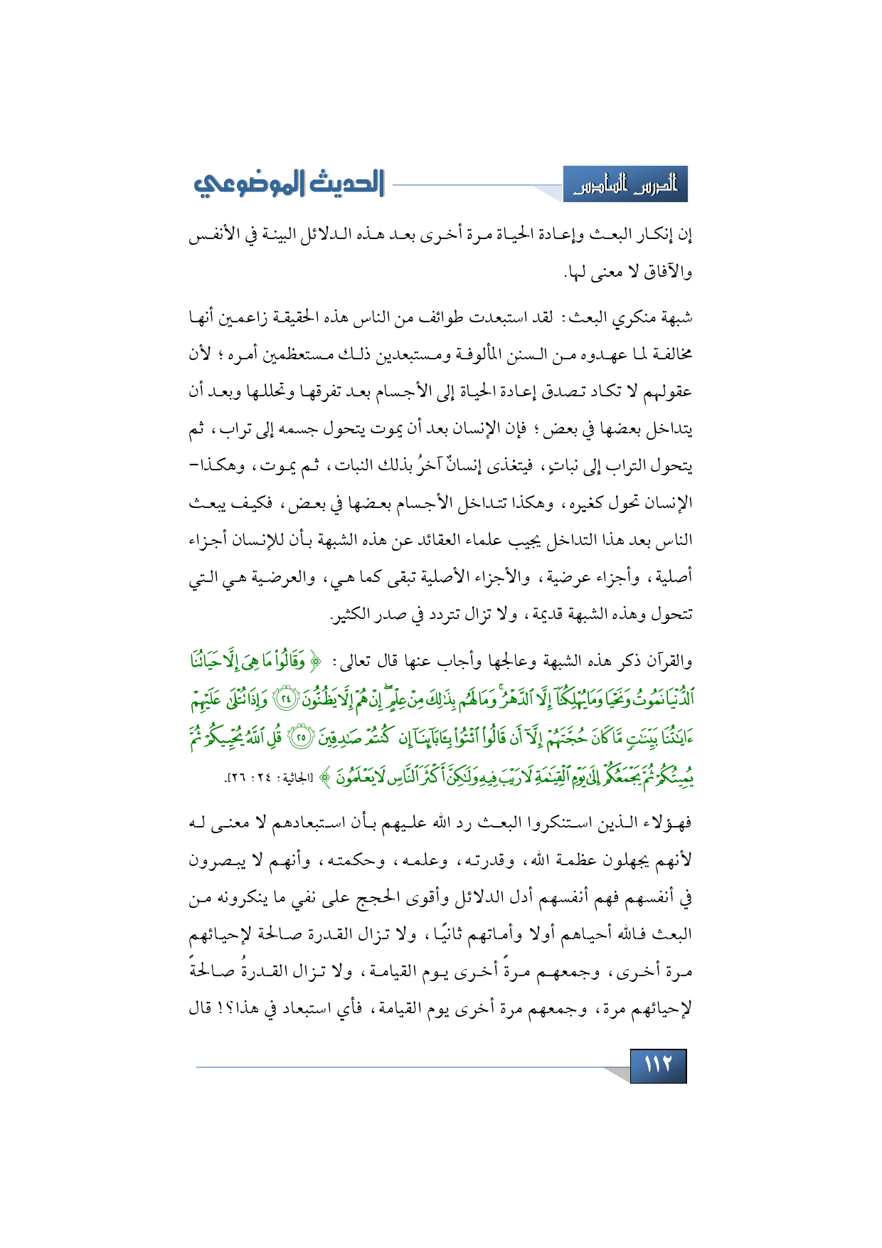 شبهة منكري البعث: لقد استبعدت طوائف من الناس هذه الحقيقة زاعمين أنها مخالفة لما عهدوه من السنن المألوفة ومستبعدين ذلك مستعظمين أمره؛ لأن عقولهم لا تكاد تصدق إعادة الحياة إلى الأجسام بعد تفرقها وتحللها وبعد أن يتداخل بعضها في بعض؛ فإن الإنسان بعد أن يموت يتحول جسمه إلى تراب، ثم يتحول التراب إلى نباتٍ، فيتغذى إنسانٌ آخرُ بذلك النبات، ثم يموت، وهكذا- الإنسان تحول كغيره، وهكذا تتداخل الأجسام بعضها في بعض، فكيف يبعث الناس بعد هذا التداخل يجيب علماء العقائد عن هذه الشبهة بأن للإنسان أجزاء أصلية، وأجزاء عرضية، والأجزاء الأصلية تبقى كما هي، والعرضية هي التي تتحول وهذه الشبهة قديمة، ولا تزال تتردد في صدر الكثير.