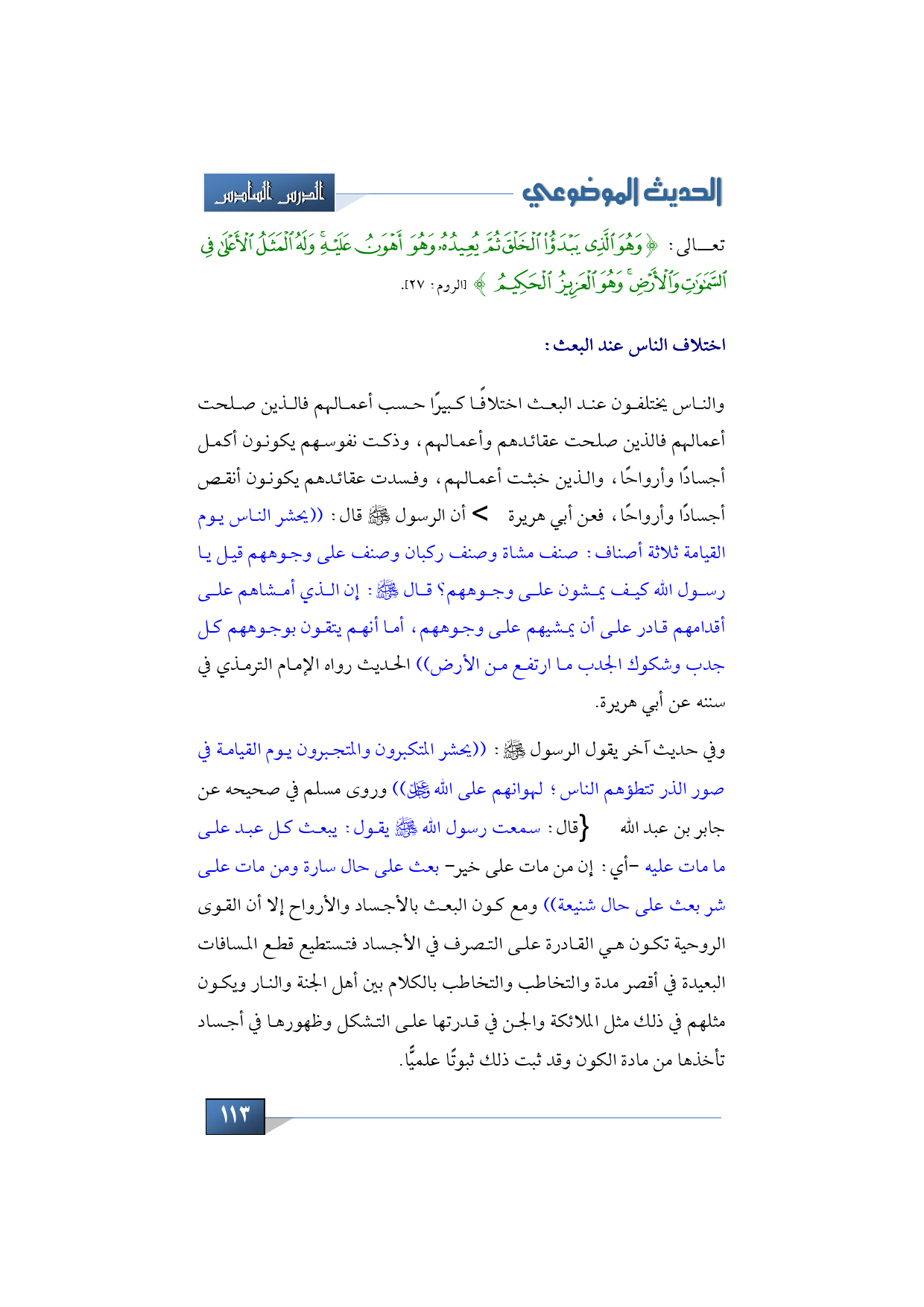 وفي حديث آخر يقول الرسول -صلى الله عليه وسلم-: ((يحشر المتكبرون والمتجبرون يوم القيامة في صور الذر تتطؤهم الناس؛ لهوانهم على الله عز وجل)) وروى مسلم في صحيحه عن جابر بن عبد الله -رضي الله عنهما- قال: سمعت رسول الله -صلى الله عليه وسلم- يقول: يبعث كل عبد على ما مات عليه -أي: إن من مات على خير- بعث على حال سارة ومن مات على شر بعث على حال شنيعة)) ومع كون البعث بالأجساد والأرواح إلا أن القوى الروحية تكون هي القادرة على التصرف في الأجساد فتستطيع قطع المسافات البعيدة في أقصر مدة والتخاطب والتخاطب بالكلام بين أهل الجنة والنار ويكون مثلهم في ذلك مثل الملائكة والجن في قدرتها على التشكل وظهورها في أجساد تأخذها من مادة الكون وقد ثبت ذلك ثبوتًا علميًّا.