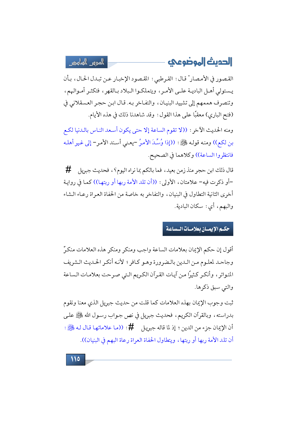 القصور في الأمصار" قال: القرطبي: المقصود الإخبار عن تبدل الحال، بأن يستولي أهل البادية على الأمر، ويتملكوا البلاد بالقهر، فتكثر أموالهم، وتنصرف هممهم إلى تشييد البنيان، والتفاخر به. قال ابن حجر العسقلاني في (فتح الباري) معقبًا على هذا القول: وقد شاهدنا ذلك في هذه الأيام.