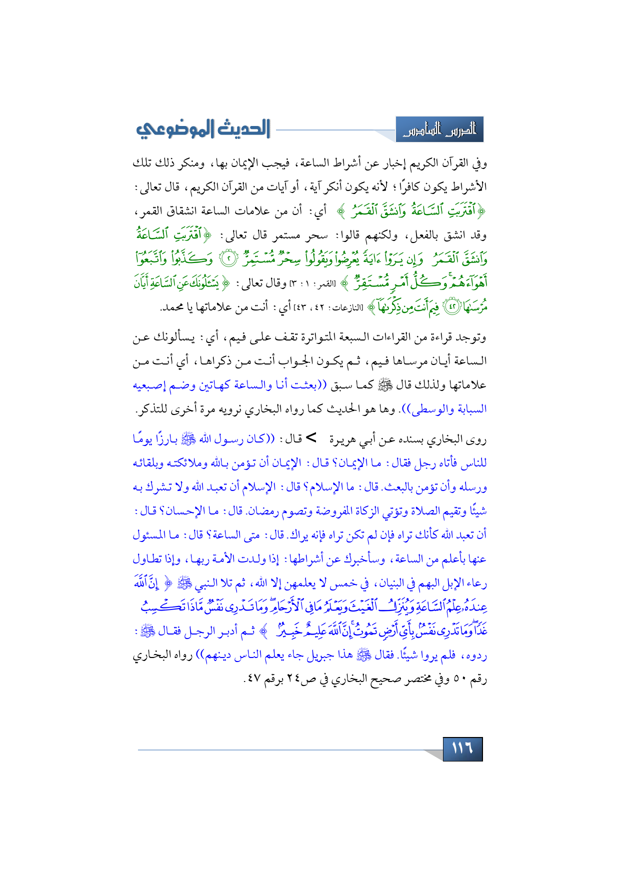 روى البخاري بسنده عن أبي هريرة -رضي الله عنه- قال: ((كان رسول الله -صلى الله عليه وسلم- بارزًا يومًا للناس فأتاه رجل فقال: ما الإيمان؟ قال: الإيمان أن تؤمن بالله وملائكته وبلقائه ورسله وأن تؤمن بالبعث. قال: ما الإسلام؟ قال: الإسلام أن تعبد الله ولا تشرك به شيئًا وتقيم الصلاة وتؤتي الزكاة المفروضة وتصوم رمضان. قال: ما الإحسان؟ قال: أن تعبد الله كأنك تراه فإن لم تكن تراه فإنه يراك. قال: متى الساعة؟ قال: ما المسئول عنها بأعلم من الساعة، وسأخبرك عن أشراطها: إذا ولدت الأمة ربها، وإذا تطاول رعاء الإبل البهم في البنيان، في خمس لا يعلمهن إلا الله، ثم تلا النبي -صلى الله عليه وسلم- {إِنَّ اللَّهَ عِنْدَهُ عِلْمُ السَّاعَةِ وَيُنَزِّلُ الْغَيْثَ وَيَعْلَمُ مَا فِي الأَرْحَامِ وَمَا تَدْرِي نَفْسٌ مَاذَا تَكْسِبُ غَدًا وَمَا تَدْرِي نَفْسٌ بِأَيِّ أَرْضٍ تَمُوتُ إِنَّ اللَّهَ عَلِيمٌ خَبِيرٌ} ثم أدبر الرجل فقال -صلى الله عليه وسلم-: ردوه، فلم يروا شيئًا. فقال -صلى الله عليه وسلم- هذا جبريل جاء يعلم الناس دينهم)) رواه البخاري رقم 50 وفي مختصر صحيح البخاري في ص24 برقم 47.