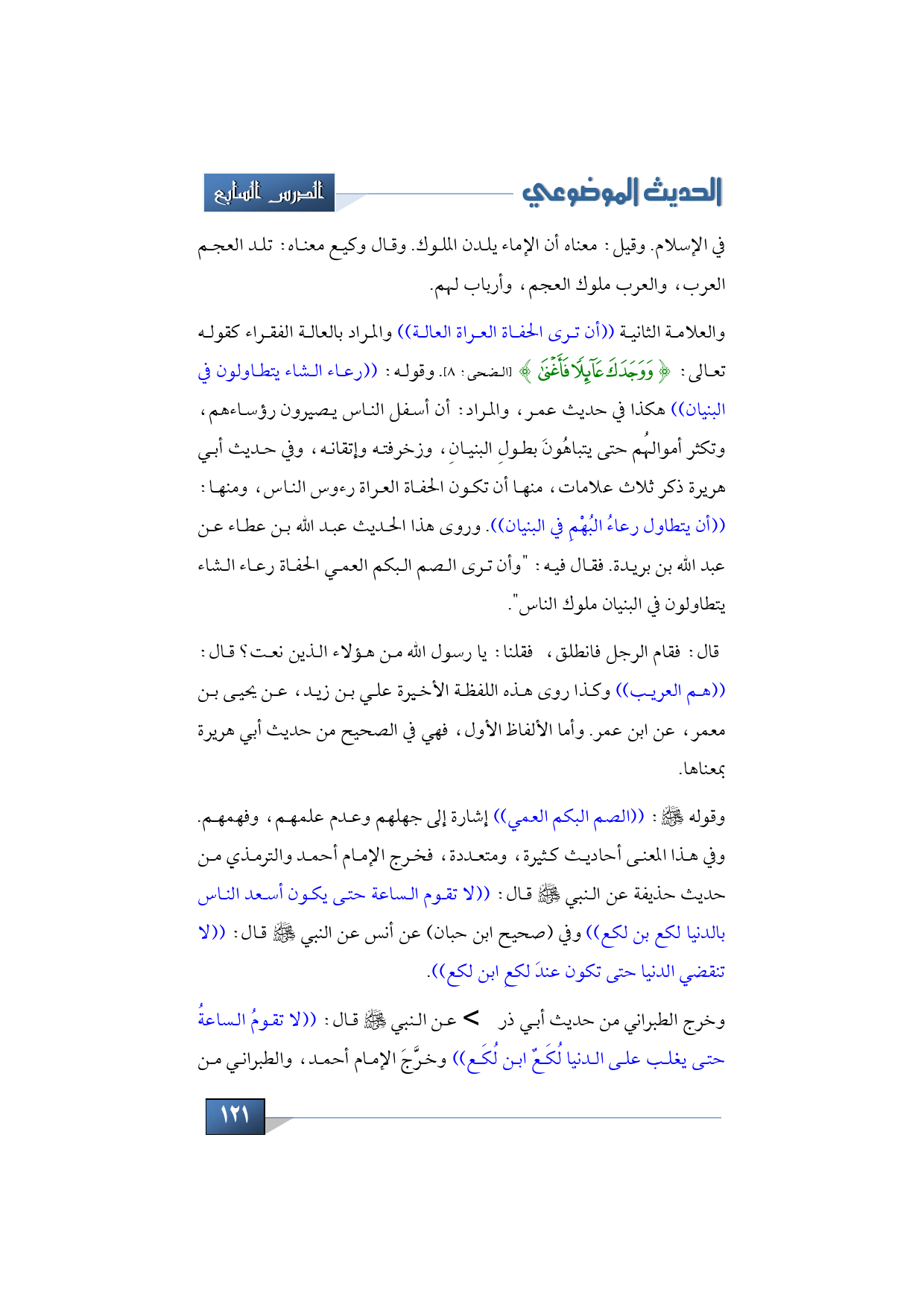 والعلامة الثانية ((أن ترى الحفاة العراة العالة)) والمراد بالعالة الفقراء كقوله تعالى: {وَوَجَدَكَ عَائِلًا فَأَغْنَى} (الضحى: 8). وقوله: ((رعاء الشاء يتطاولون في البنيان)) هكذا في حديث عمر، ووالمراد: أن أسفل الناس يصيرون رؤساءهم، وتكثر أموالهُم حتى يتباهُونَ بطولِ البنيانِ، وزخرفته وإتقانه، وفي حديث أبي هريرة ذكر ثلاث علامات، منها أن تكون الحفاة العراة رءوس الناس، ومنها: ((أن يتطاول رعاءُ البُهْمِ في البنيان)). وروى هذا الحديث عبد الله بن عطاء عن عبد الله بن بريدة. فقال فيه: "وأن ترى الصم البكم العمي الحفاة رعاء الشاء يتطاولون في البنيان ملوك الناس".