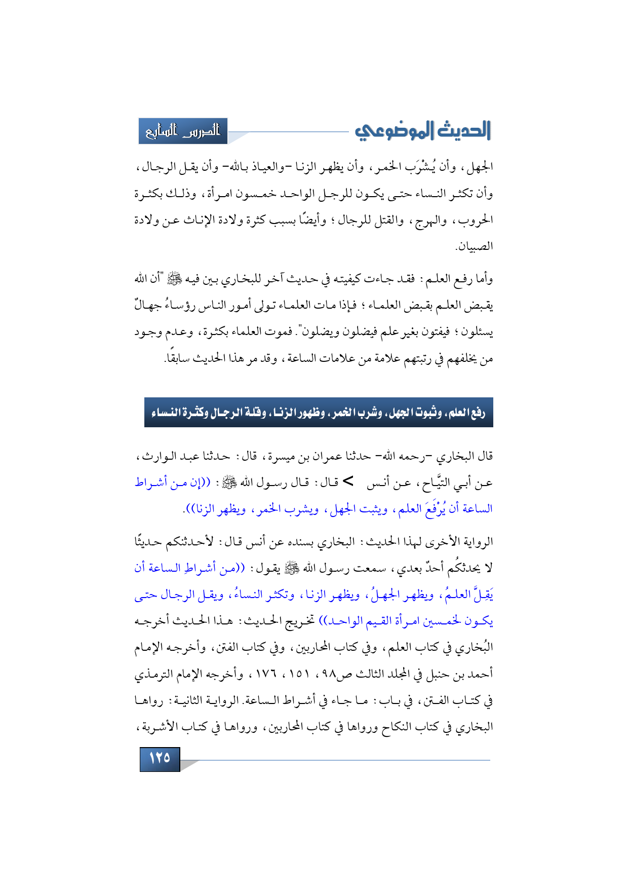 الرواية الأخرى لهذا الحديث: البخاري بسنده عن أنس قال: لأحدثنكم حديثًا لا يحدثكُم أحدٌ بعدي، سمعت رسول الله -صلى الله عليه وسلم- يقول: ((من أشراطِ الساعة أن يَقِلَّ العلمُ، ويظهر الجهلُ، ويظهر الزنا، وتكثر النساءُ، ويقل الرجال حتى يكون لخمسين امرأة القيم الواحد)) تخريج الحديث: هذا الحديث أخرجه البُخاري في كتاب العلم، وفي كتاب المحاربين، وفي كتاب الفتن، وأخرجه الإمام أحمد بن حنبل في المجلد الثالث ص98، 151، 176، وأخرجه الإمام الترمذي في كتاب الفتن، في باب: ما جاء في أشراط الساعة. الرواية الثانية: رواها البخاري في كتاب النكاح ورواها في كتاب المحاربين، ورواها في كتاب الأشربة،