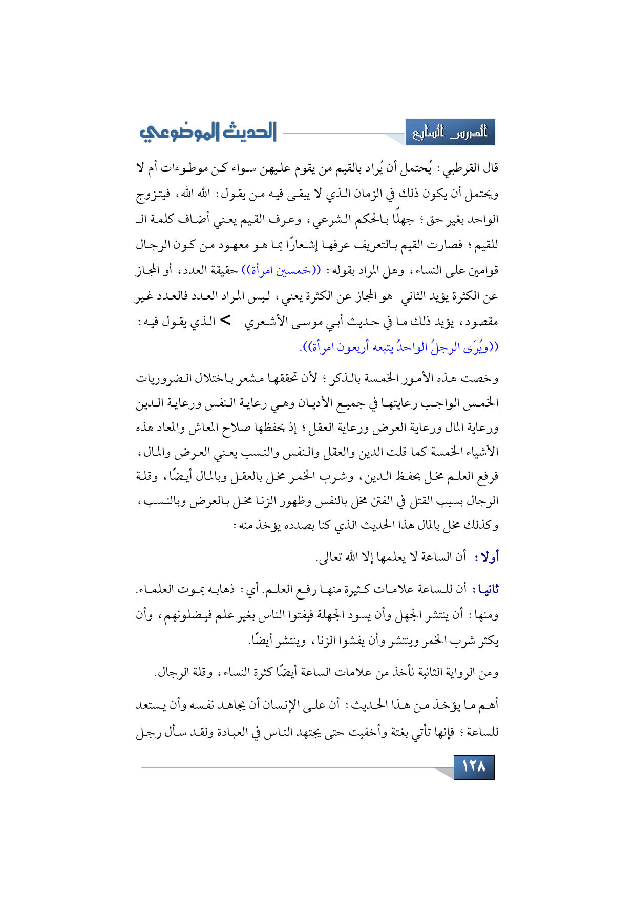 قال القرطبي: يُحتمل أن يُراد بالقيم من يقوم عليهن سواء كن موطوءات أم لا ويحتمل أن يكون ذلك في الزمان الذي لا يبقى فيه من يقول: الله الله، فيتزوج الواحد بغير حق؛ جهلًا بالحكم الشرعي، وعرف القيم يعني أضاف كلمة الـ للقيم؛ فصارت القيم بالتعريف عرفها إشعارًا بما هو معهود من كون الرجال قوامين على النساء، وهل المراد بقوله: ((خمسين امرأة)) حقيقة العدد، أو المجاز عن الكثرة يؤيد الثاني هو المجاز عن الكثرة يعني، ليس المراد العدد فالعدد غير مقصود، يؤيد ذلك ما في حديث أبي موسى الأشعري -رضي الله عنه- الذي يقول فيه: ((ويُرَى الرجلُ الواحدُ يتبعه أربعون امرأة)).