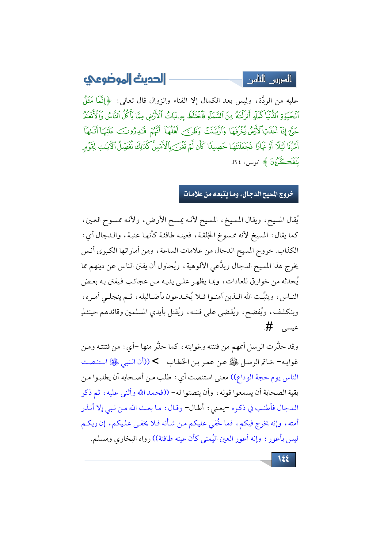 يُقال المسيح، ويقال المسيخ، المسيح لأنه يمسح الأرض، ولأنه ممسوح العين، كما يقال: المسيخ لأنه ممسوخ الخِلقة، فعينه طافئة كأنها عنبة، والدجال أي: الكذاب. خروج المسيح الدجال من علامات الساعة، ومن أماراتها الكبرى أنس يخرج هذا المسيح الدجال ويدَّعي الألوهية، ويُحاول أن يفتن الناس عن دينهم مما يُحدثه من خوارق للعادات، وبما يظهر على يديه من عجائب فيفتن به بعض الناس، ويثبِّت الله الذين آمنوا فلا يُخدعون بأضاليله، ثم ينجلي أمره، وينكشف، ويُفضح، ويُقضى على فتنته، ويُقتل بأيدي المسلمين وقائدهم حينئذٍ عيسى -عليه السلام.