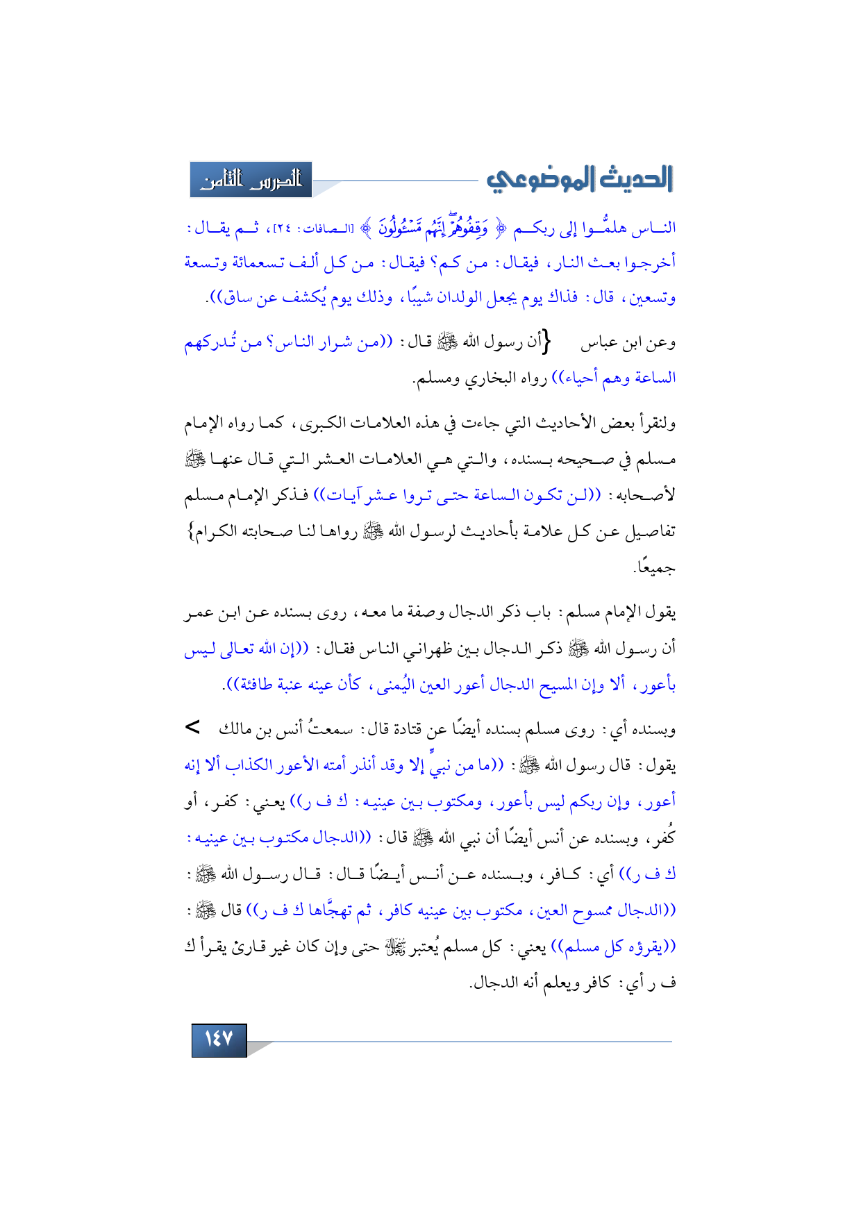 ولنقرأ بعض الأحاديث التي جاءت في هذه العلامات الكبرى، كما رواه الإمام مسلم في صحيحه بسنده، والتي هي العلامات العشر التي قال عنها -صلى الله عليه وسلم- لأصحابه: ((لن تكون الساعة حتى تروا عشر آيات)) فذكر الإمام مسلم تفاصيل عن كل علامة بأحاديث لرسول الله -صلى الله عليه وسلم- رواها لنا صحابته الكرام -رضي الله عنهم جميعًا.