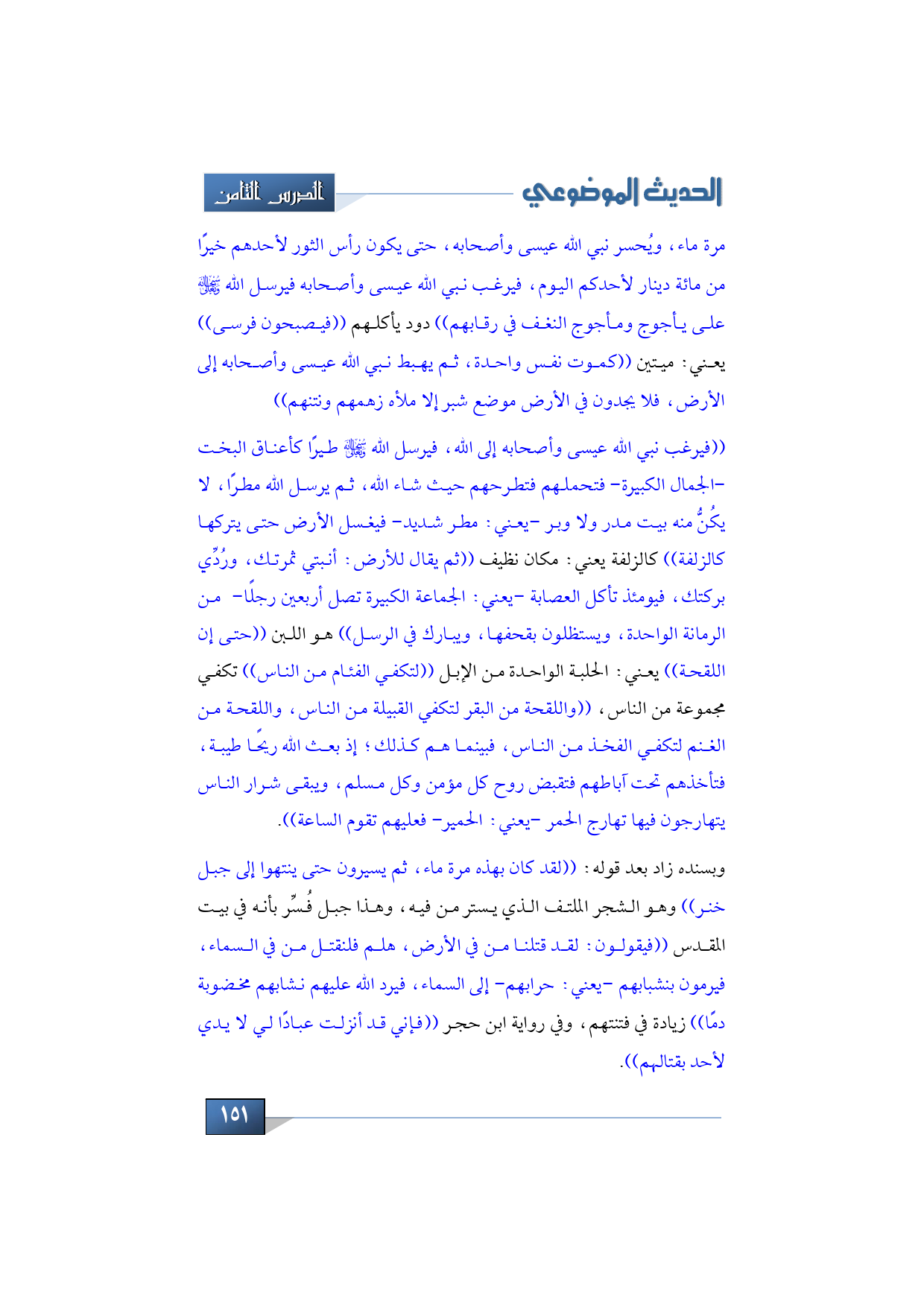 ((فيرغب نبي الله عيسى وأصحابه إلى الله، فيرسل الله -سبحانه وتعالى- طيرًا كأعناق البخت -الجمال الكبيرة- فتحملهم فتطرحهم حيث شاء الله، ثم يرسل الله مطرًا، لا يكُنُّ منه بيت مدر ولا وبر -يعني: مطر شديد- فيغسل الأرض حتى يتركها كالزلفة)) كالزلفة يعني: مكان نظيف ((ثم يقال للأرض: أنبتي ثمرتك، ورُدِّي بركتك، فيومئذ تأكل العصابة -يعني: الجماعة الكبيرة تصل أربعين رجلًا- من الرمانة الواحدة، ويستظلون بقحفها، ويبارك في الرسل)) هو اللبن ((حتى إن اللقحة)) يعني: الحلبة الواحدة من الإبل ((لتكفي الفئام من الناس)) تكفي مجموعة من الناس، ((واللقحة من البقر لتكفي القبيلة من الناس، واللقحة من الغنم لتكفي الفخذ من الناس، فبينما هم كذلك؛ إذ بعث الله ريحًا طيبة، فتأخذهم تحت آباطهم فتقبض روح كل مؤمن وكل مسلم، ويبقى شرار الناس يتهارجون فيها تهارج الحمر -يعني: الحمير- فعليهم تقوم الساعة)).