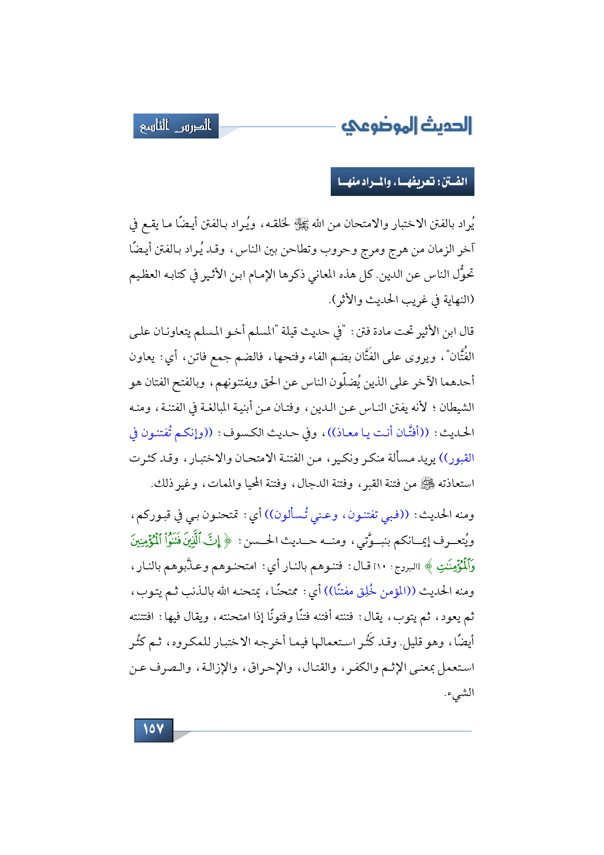 ومنه الحديث: ((فبي تفتنون، وعني تُسألون)) أي: تمتحنون بي في قبوركم، ويُتعرف إيمانكم بنبوَّتي، ومنه حديث الحسن: {إِنَّ الَّذِينَ فَتَنُوا الْمُؤْمِنِينَ وَالْمُؤْمِنَاتِ} (البروج: 10) قال: فتنوهم بالنار أي: امتحنوهم وعذَّبوهم بالنار، ومنه الحديث ((المؤمن خُلِق مفتنًا)) أي: ممتحنًا، يمتحنه الله بالذنب ثم يتوب، ثم يعود، ثم يتوب، يقال: فتنته أفتنه فتنًا وفتونًا إذا امتحنته، ويقال فيها: افتتنته أيضًا، وهو قليل. وقد كَثُر استعمالها فيما أخرجه الاختبار للمكروه، ثم كثُر استعمل بمعنى الإثم والكفر، والقتال، والإحراق، والإزالة، والصرف عن الشيء.