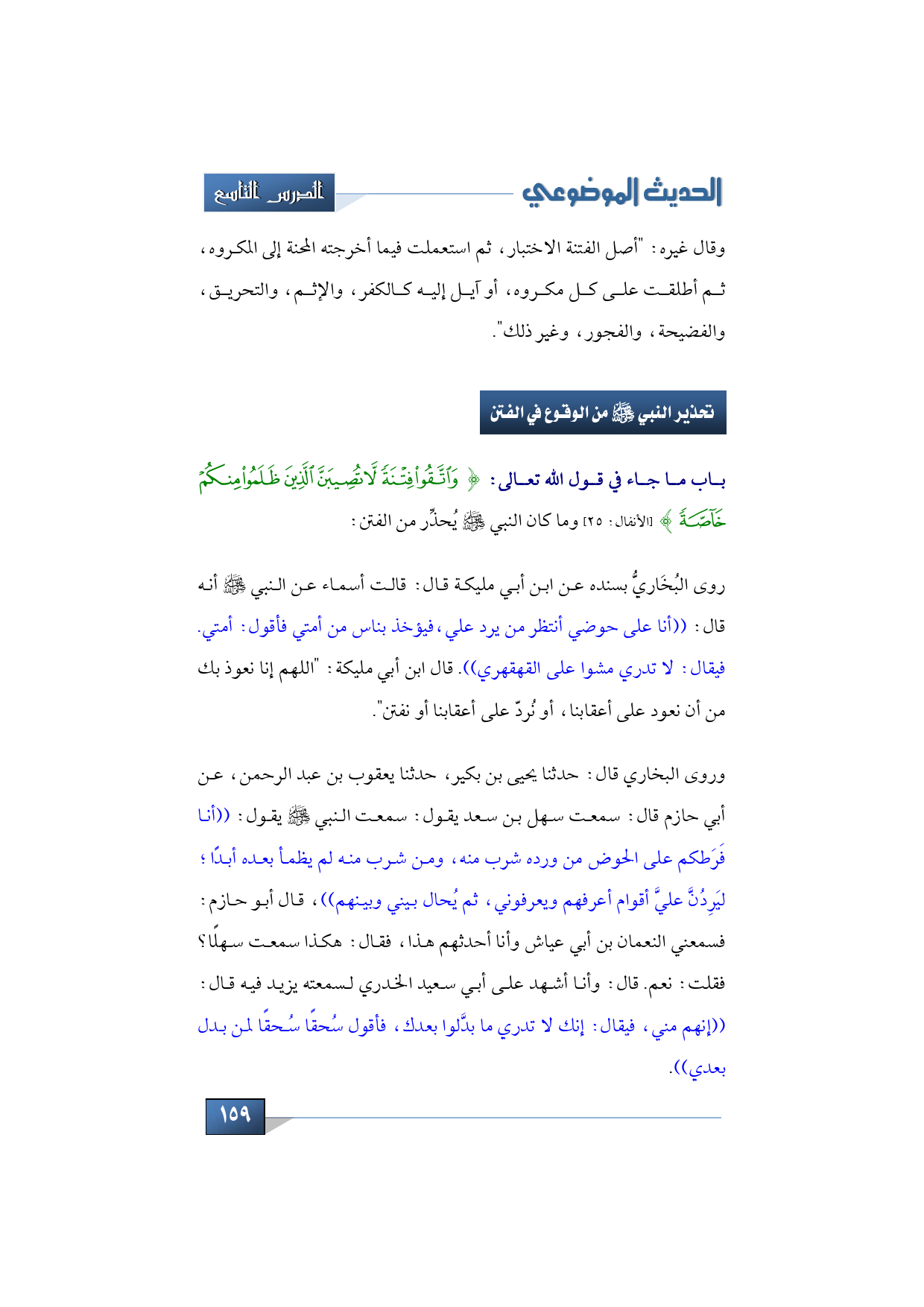 باب ما جاء في قول الله تعالى: {وَاتَّقُوا فِتْنَةً لَا تُصِيبَنَّ الَّذِينَ ظَلَمُوا مِنْكُمْ خَاصَّةً} (الأنفال: 25) وما كان النبي -صلى الله عليه وسلم- يُحذِّر من الفتن: