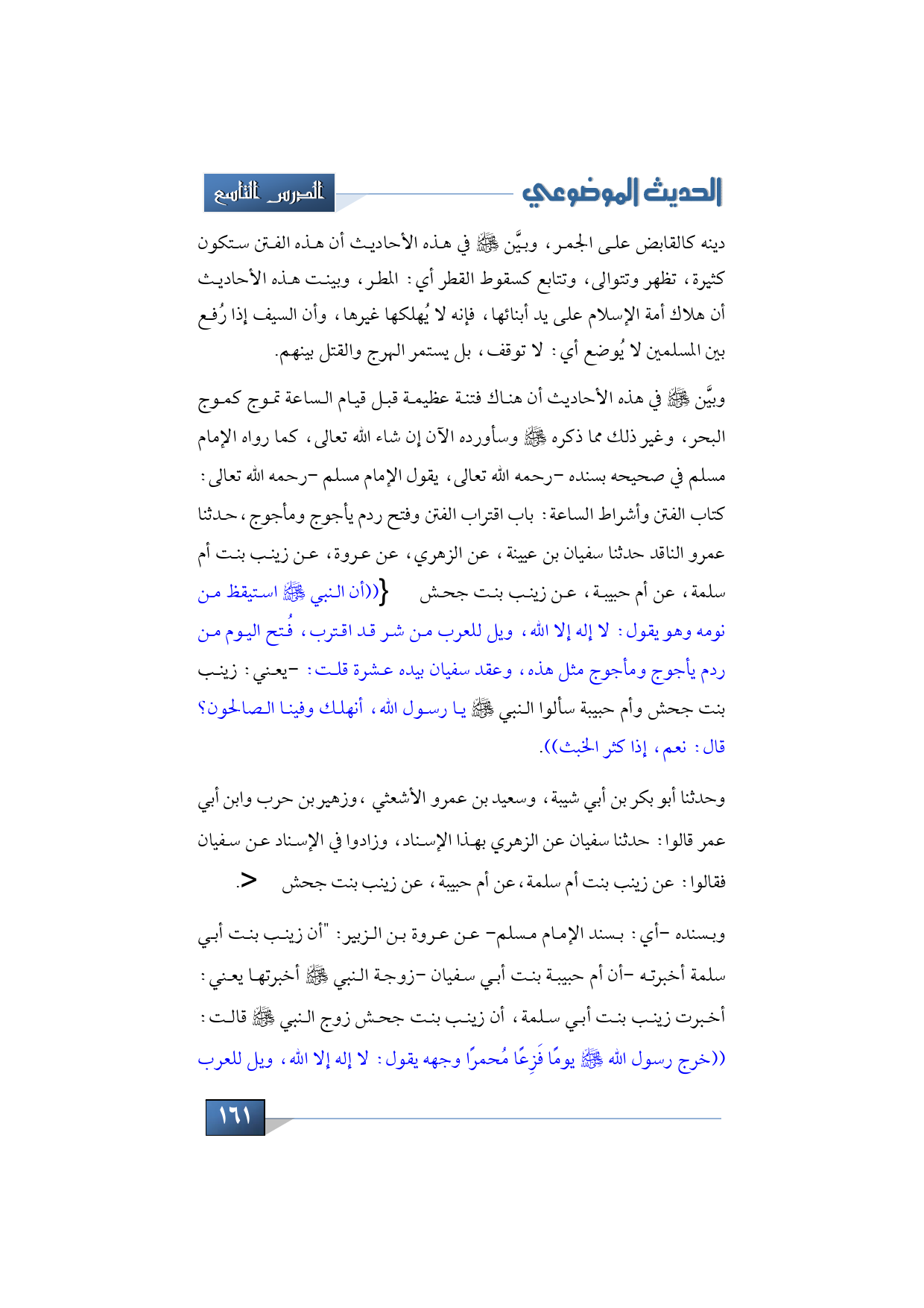 وبسنده -أي: بسند الإمام مسلم- عن عروة بن الزبير: "أن زينب بنت أبي سلمة أخبرته -أن أم حبيبة بنت أبي سفيان -زوجة النبي -عليه الصلاة والسلام- أخبرتها يعني: أخبرت زينب بنت أبي سلمة، أن زينب بنت جحش زوج النبي -صلى الله عليه وسلم- قالت: ((خرج رسول الله -صلى الله عليه وسلم- يومًا فَزِعًا مُحمرًا وجهه يقول: لا إله إلا الله، ويل للعرب