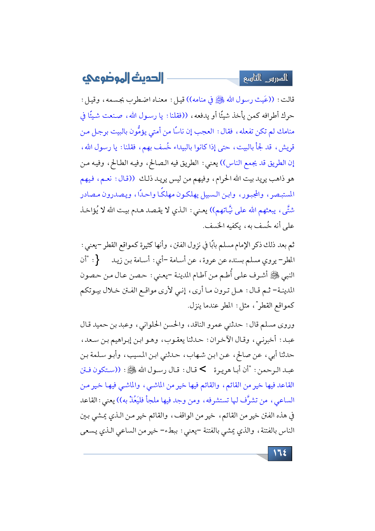قالت: ((عَبِث رسول الله -صلى الله عليه وسلم- في منامه)) قيل: معناه اضطرب بجسمه، وقيل: حرك أطرافه كمن يأخذ شيئًا أو يدفعه، ((فقلنا: يا رسول الله، صنعت شيئًا في منامك لم تكن تفعله، فقال: العجب إن ناسًا من أمتي يؤمُّون بالبيت برجل من قريش، قد لجأ بالبيت، حتى إذا كانوا بالبيداء خُسف بهم، فقلنا: يا رسول الله، إن الطريق قد يجمع الناس)) يعني: الطريق فيه الصالح، وفيه الطالح، وفيه من هو ذاهب يريد بيت الله الحرام، وفيهم من ليس يريد ذلك ((قال: نعم، فيهم المستبصر، والمجبور، وابن السبيل يهلكون مهلكًا واحدًا، ويصدرون مصادر شتَّى، يبعثهم الله على نيَّاتهم)) يعني: الذي لا يقصد هدم بيت الله لا يُؤاخذ على أنه خُسف به، يكفيه الخسف.