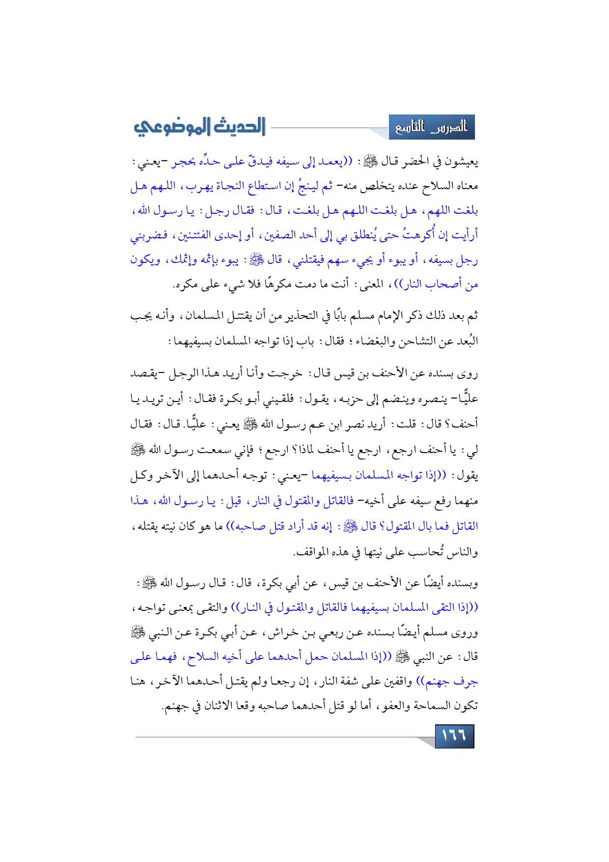 وبسنده أيضًا عن الأحنف بن قيس، عن أبي بكرة، قال: قال رسول الله -صلى الله عليه وسلم: ((إذا التقى المسلمان بسيفيهما فالقاتل والمقتول في النار)) والتقى بمعنى تواجه، وروى مسلم أيضًا بسنده عن ربعي بن خراش، عن أبي بكرة عن النبي -صلى الله عليه وسلم- قال: