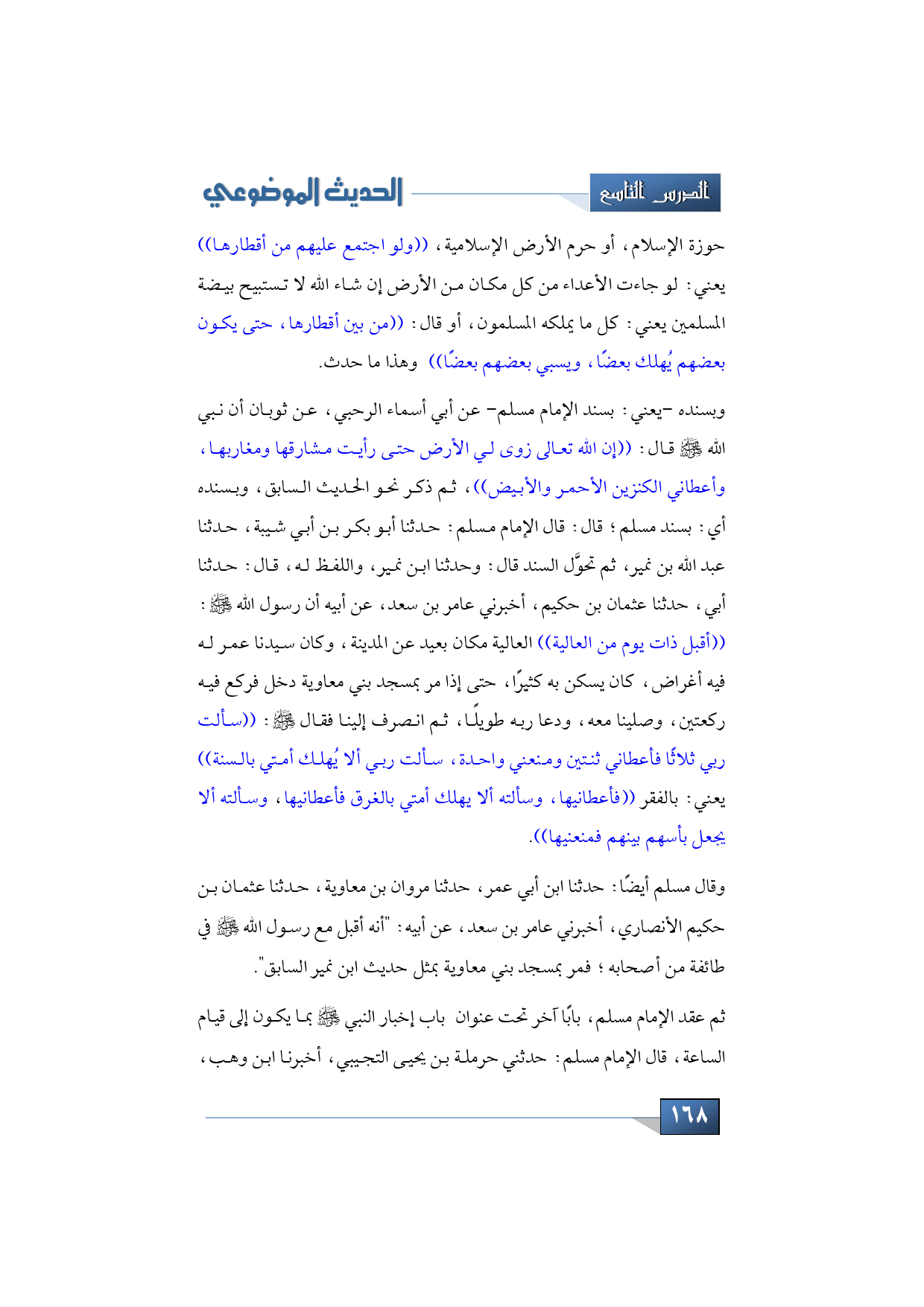 وبسنده -يعني: بسند الإمام مسلم- عن أبي أسماء الرحبي، عن ثوبان أن نبي الله -صلى الله عليه وسلم- قال: ((إن الله تعالى زوى لي الأرض حتى رأيت مشارقها ومغاربها، وأعطاني الكنزين الأحمر والأبيض))، ثم ذكر نحو الحديث السابق، وبسنده أي: بسند مسلم؛ قال: قال الإمام مسلم: حدثنا أبو بكر بن أبي شيبة، حدثنا عبد الله بن نمير، ثم تحوَّل السند قال: وحدثنا ابن نمير، واللفظ له، قال: حدثنا أبي، حدثنا عثمان بن حكيم، أخبرني عامر بن سعد، عن أبيه أن رسول الله -صلى الله عليه وسلم: ((أقبل ذات يوم من العالية)) العالية مكان بعيد عن المدينة، وكان سيدنا عمر له فيه أغراض، كان يسكن به كثيرًا، حتى إذا مر بمسجد بني معاوية دخل فركع فيه ركعتين، وصلينا معه، ودعا ربه طويلًا، ثم انصرف إلينا فقال -صلى الله عليه وسلم: ((سألت ربي ثلاثًا فأعطاني ثنتين ومنعني واحدة، سألت ربي ألا يُهلك أمتي بالسنة)) يعني: بالفقر ((فأعطانيها، وسألته ألا يهلك أمتي بالغرق فأعطانيها، وسألته ألا يجعل بأسهم بينهم فمنعنيها)).