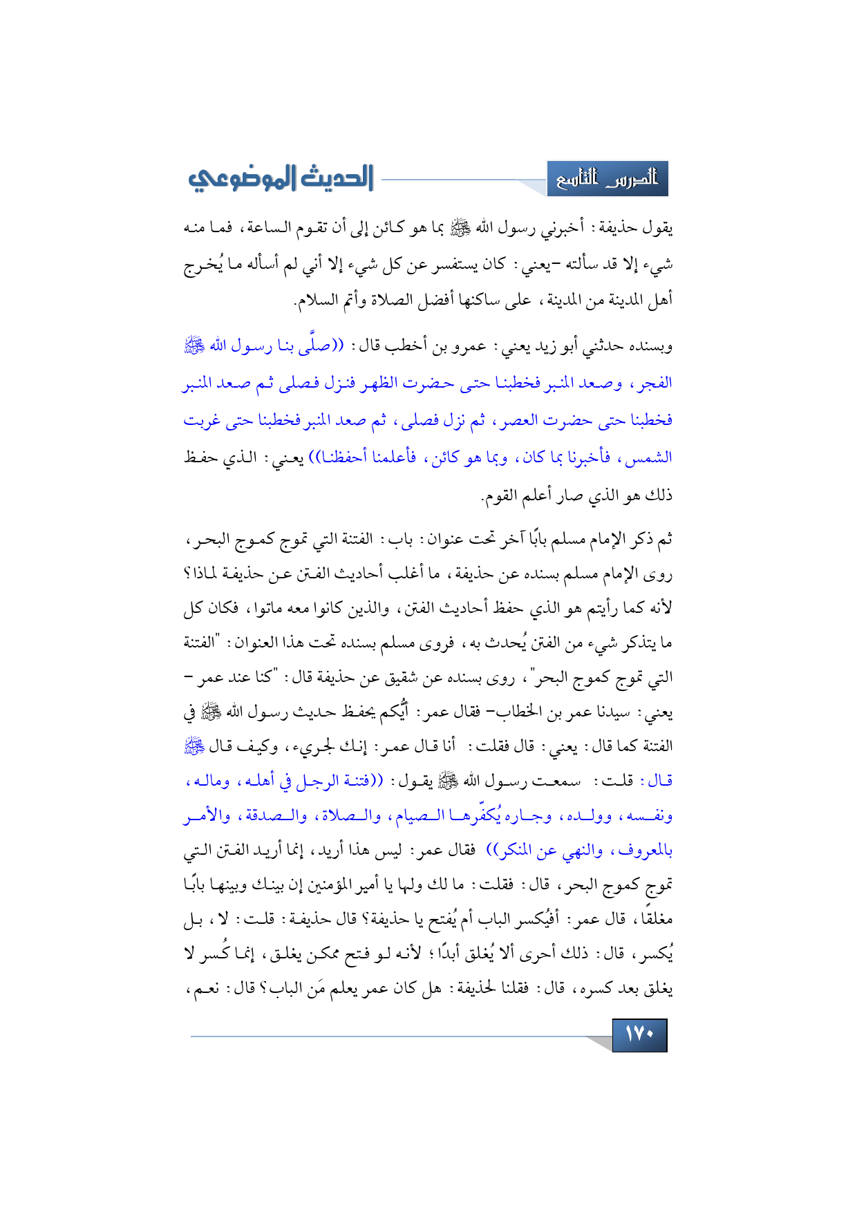 ثم ذكر الإمام مسلم بابًا آخر تحت عنوان: باب: الفتنة التي تموج كموج البحر، روى الإمام مسلم بسنده عن حذيفة، ما أغلب أحاديث الفتن عن حذيفة لماذا؟ لأنه كما رأيتم هو الذي حفظ أحاديث الفتن، والذين كانوا معه ماتوا، فكان كل ما يتذكر شيء من الفتن يُحدث به، فروى مسلم بسنده تحت هذا العنوان: "الفتنة التي تموج كموج البحر"، روى بسنده عن شقيق عن حذيفة قال: "كنا عند عمر -يعني: سيدنا عمر بن الخطاب- فقال عمر: أيُّكم يحفظ حديث رسول الله -صلى الله عليه وسلم- في الفتنة كما قال: يعني: قال فقلت: أنا قال عمر: إنك لجريء، وكيف قال -صلى الله عليه وسلم- قال: قلت: سمعت رسول الله -صلى الله عليه وسلم- يقول: ((فتنة الرجل في أهله، وماله، ونفسه، وولده، وجاره يُكفّرها الصيام، والصلاة، والصدقة، والأمر بالمعروف، والنهي عن المنكر)) فقال عمر: ليس هذا أريد، إنما أريد الفتن التي تموج كموج البحر، قال: فقلت: ما لك ولها يا أمير المؤمنين إن بينك وبينها بابًا مغلقًا، قال عمر: أفيُكسر الباب أم يُفتح يا حذيفة؟ قال حذيفة: قلت: لا، بل يُكسر، قال: ذلك أحرى ألا يُغلق أبدًا؛ لأنه لو فتح ممكن يغلق، إنما كُسر لا يغلق بعد كسره، قال: فقلنا لحذيفة: هل كان عمر يعلم مَن الباب؟ قال: نعم،
