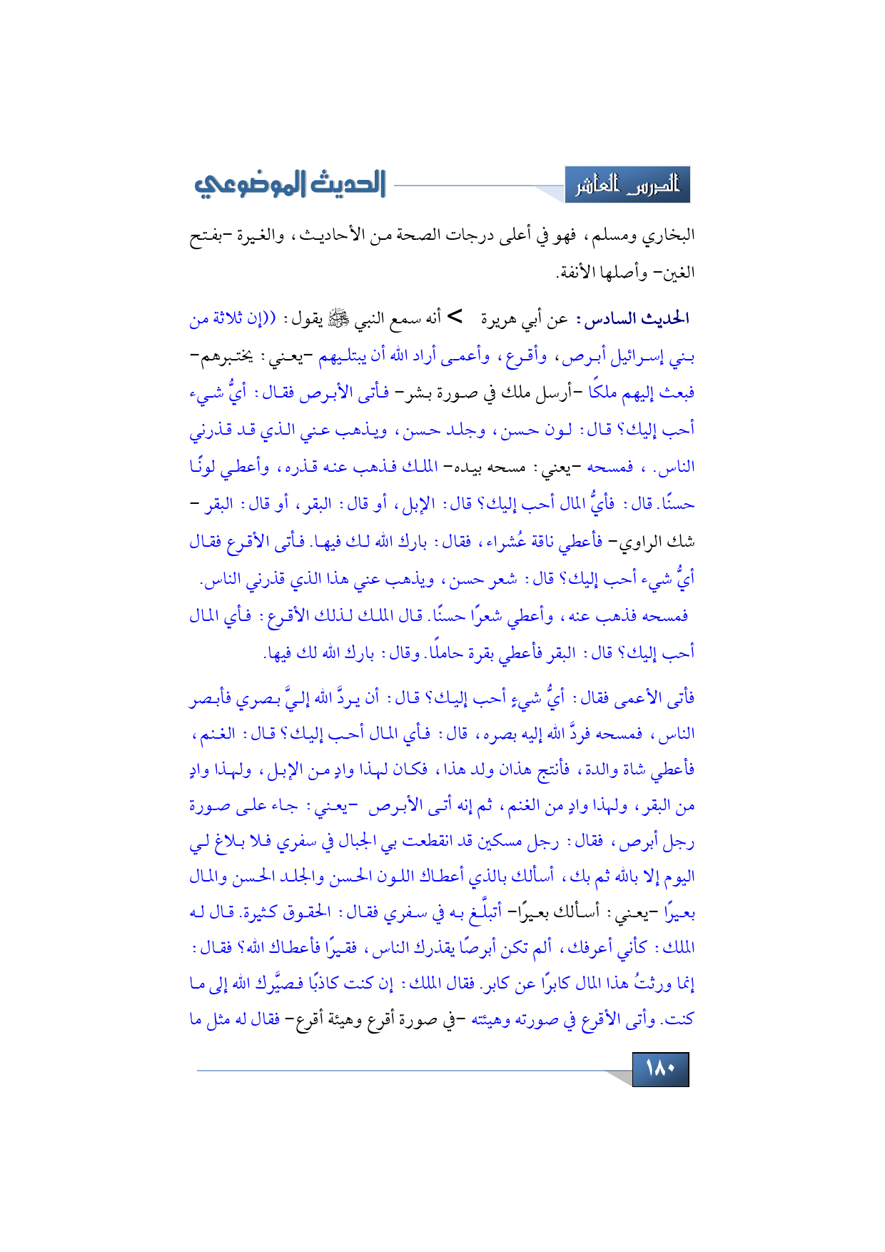 الحديث السادس: عن أبي هريرة -رضي الله عنه- أنه سمع النبي -صلى الله عليه وسلم- يقول: ((إن ثلاثة من بني إسرائيل أبرص، وأقرع، وأعمى أراد الله أن يبتليهم -يعني: يختبرهم- فبعث إليهم ملكًا -أرسل ملك في صورة بشر- فأتى الأبرص فقال: أيُّ شيء أحب إليك؟ قال: لون حسن، وجلد حسن، ويذهب عني الذي قد قذرني الناس.، فمسحه -يعني: مسحه بيده- الملك فذهب عنه قذره، وأعطي لونًا حسنًا. قال: فأيُّ المال أحب إليك؟ قال: الإبل، أو قال: البقر، أو قال: البقر -شك الراوي- فأعطي ناقة عُشراء، فقال: بارك الله لك فيها. فأتى الأقرع فقال أيُّ شيء أحب إليك؟ قال: شعر حسن، ويذهب عني هذا الذي قذرني الناس. فمسحه فذهب عنه، وأعطي شعرًا حسنًا. قال الملك لذلك الأقرع: فأي المال أحب إليك؟ قال: البقر فأعطي بقرة حاملًا. وقال: بارك الله لك فيها.