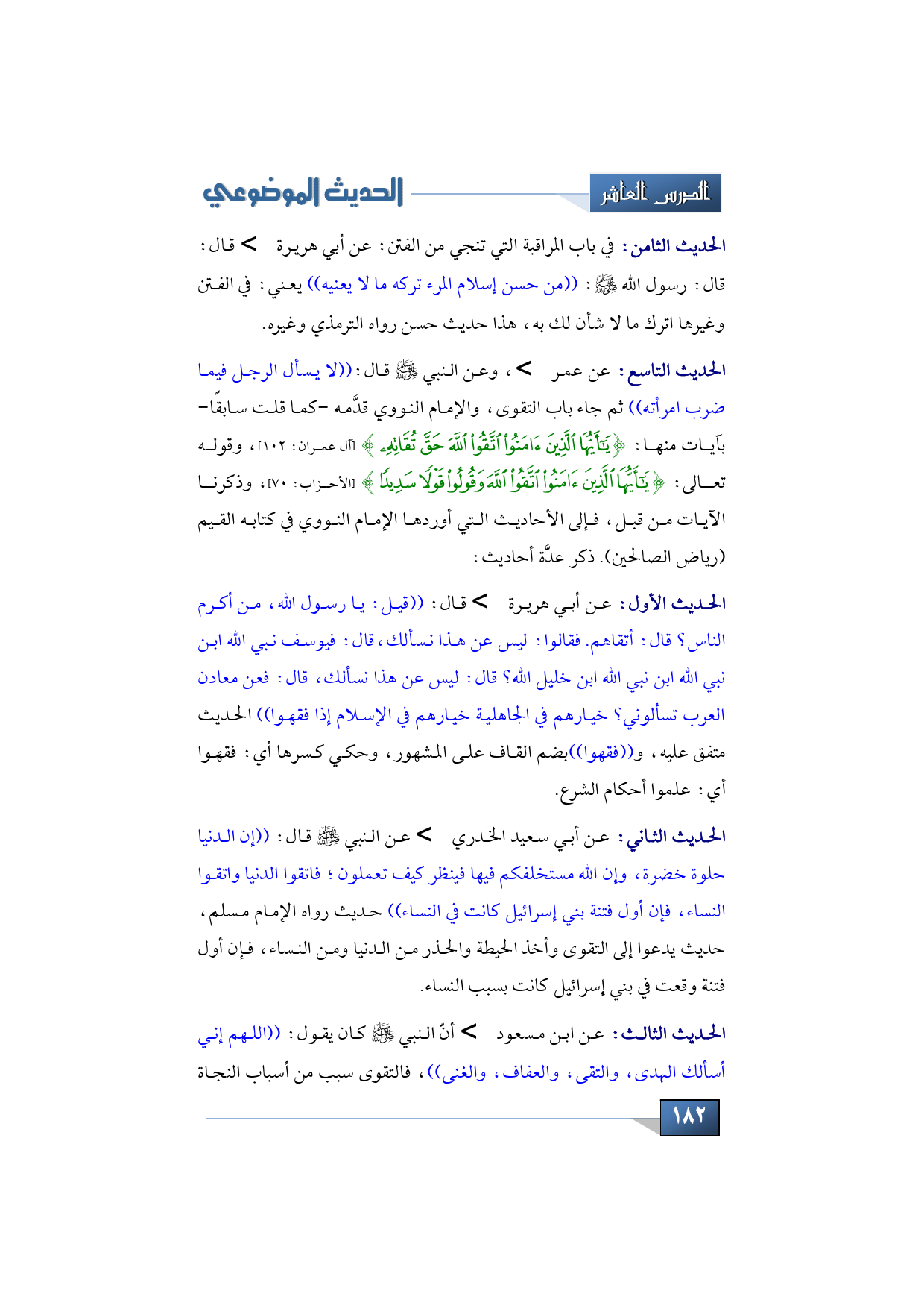 الحديث الثامن: في باب المراقبة التي تنجي من الفتن: عن أبي هريرة -رضي الله عنه- قال: قال: رسول الله -صلى الله عليه وسلم-: ((من حسن إسلام المرء تركه ما لا يعنيه)) يعني: في الفتن وغيرها اترك ما لا شأن لك به، هذا حديث حسن رواه الترمذي وغيره.