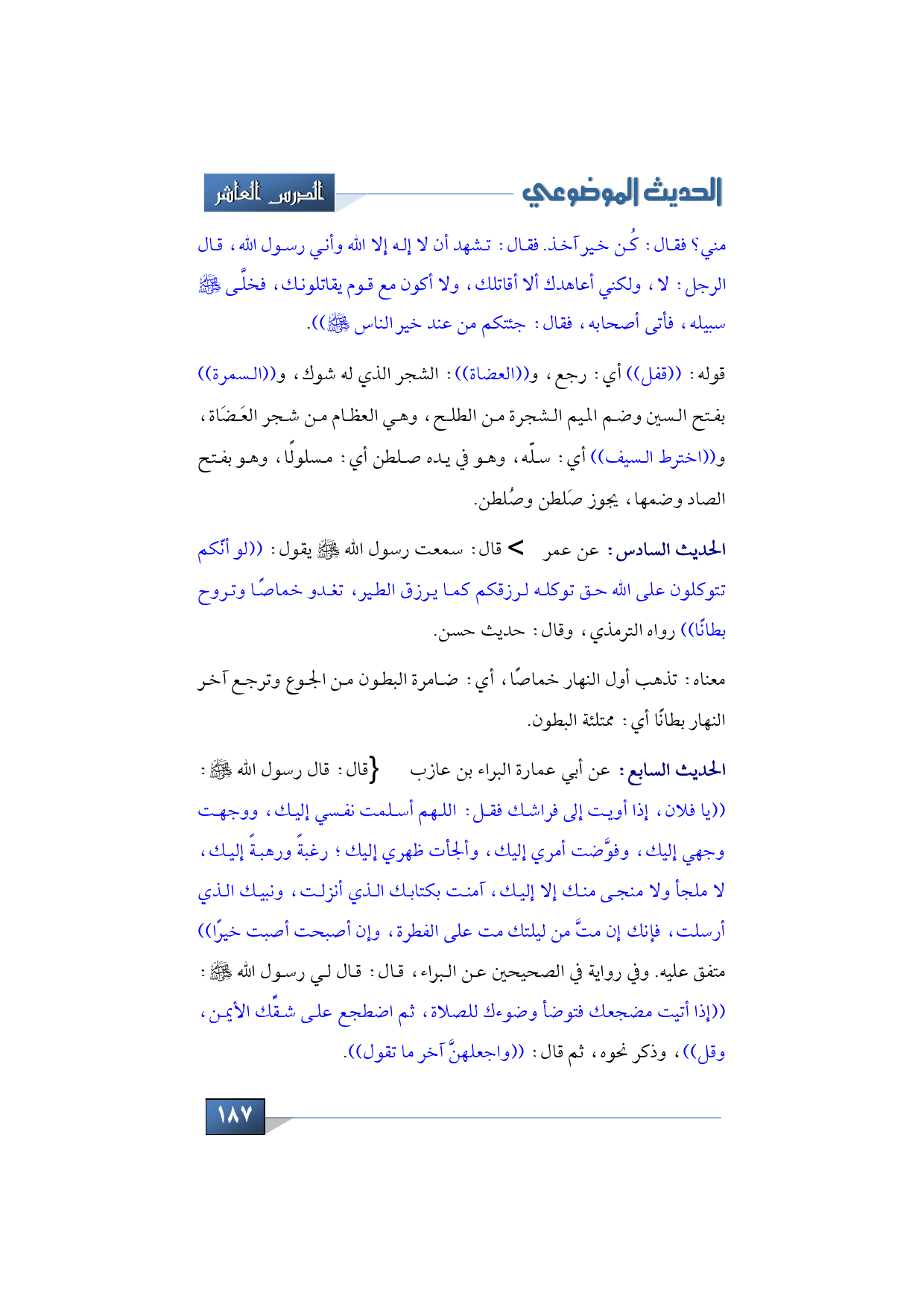 الحديث السابع: عن أبي عمارة البراء بن عازب -رضي الله عنهما- قال: قال رسول الله -صلى الله عليه وسلم: ((يا فلان، إذا أويت إلى فراشك فقل: اللهم أسلمت نفسي إليك، ووجهت وجهي إليك، وفوَّضت أمري إليك، وألجأت ظهري إليك؛ رغبةً ورهبةً إليك، لا ملجأ ولا منجى منك إلا إليك، آمنت بكتابك الذي أنزلت، ونبيك الذي أرسلت، فإنك إن متَّ من ليلتك مت على الفطرة، وإن أصبحت أصبت خيرًا)) متفق عليه. وفي رواية في الصحيحين عن البراء، قال: قال لي رسول الله -صلى الله عليه وسلم: ((إذا أتيت مضجعك فتوضأ وضوءك للصلاة، ثم اضطجع على شقِّك الأيمن، وقل))، وذكر نحوه، ثم قال: ((واجعلهنَّ آخر ما تقول)).