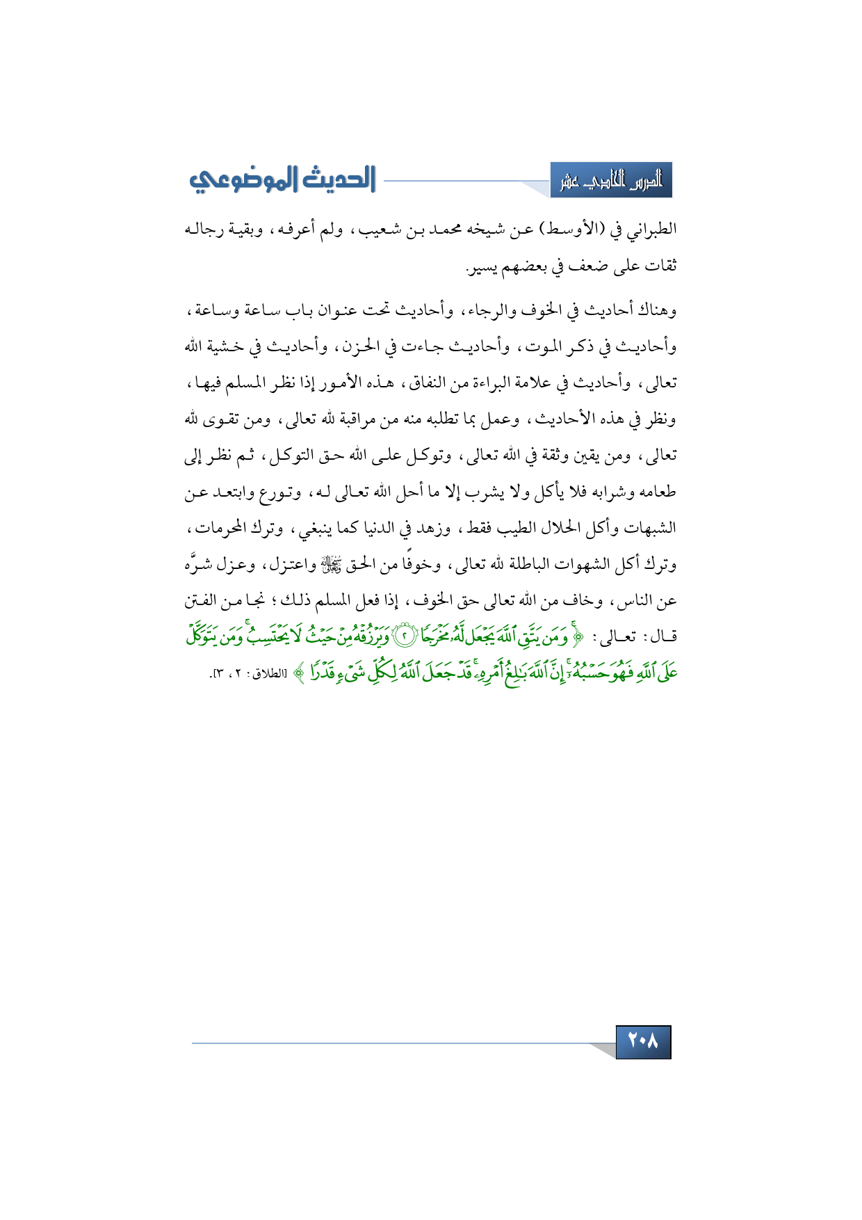 وهناك أحاديث في الخوف والرجاء، وأحاديث تحت عنوان باب ساعة وساعة، وأحاديث في ذكر الموت، وأحاديث جاءت في الحزن، وأحاديث في خشية الله تعالى، وأحاديث في علامة البراءة من النفاق، هذه الأمور إذا نظر المسلم فيها، ونظر في هذه الأحاديث، وعمل بما تطلبه منه من مراقبة لله تعالى، ومن تقوى لله تعالى، ومن يقين وثقة في الله تعالى، وتوكل على الله حق التوكل، ثم نظر إلى طعامه وشرابه فلا يأكل ولا يشرب إلا ما أحل الله تعالى له، وتورع وابتعد عن الشبهات وأكل الحلال الطيب فقط، وزهد في الدنيا كما ينبغي، وترك المحرمات، وترك أكل الشهوات الباطلة لله تعالى، وخوفًا من الحق -سبحانه وتعالى- واعتزل، وعزل شرَّه عن الناس، وخاف من الله تعالى حق الخوف، إذا فعل المسلم ذلك؛ نجا من الفتن قال: تعالى: {وَمَنْ يَتَّقِ اللَّهَ يَجْعَلْ لَهُ مَخْرَجًا * وَيَرْزُقْهُ مِنْ حَيْثُ لا يَحْتَسِبُ وَمَنْ يَتَوَكَّلْ عَلَى اللَّهِ فَهُوَ حَسْبُهُ إِنَّ اللَّهَ بَالِغُ أَمْرِهِ قَدْ جَعَلَ اللَّهُ لِكُلِّ شَيْءٍ قَدْرًا} (الطلاق: 2 - 3).