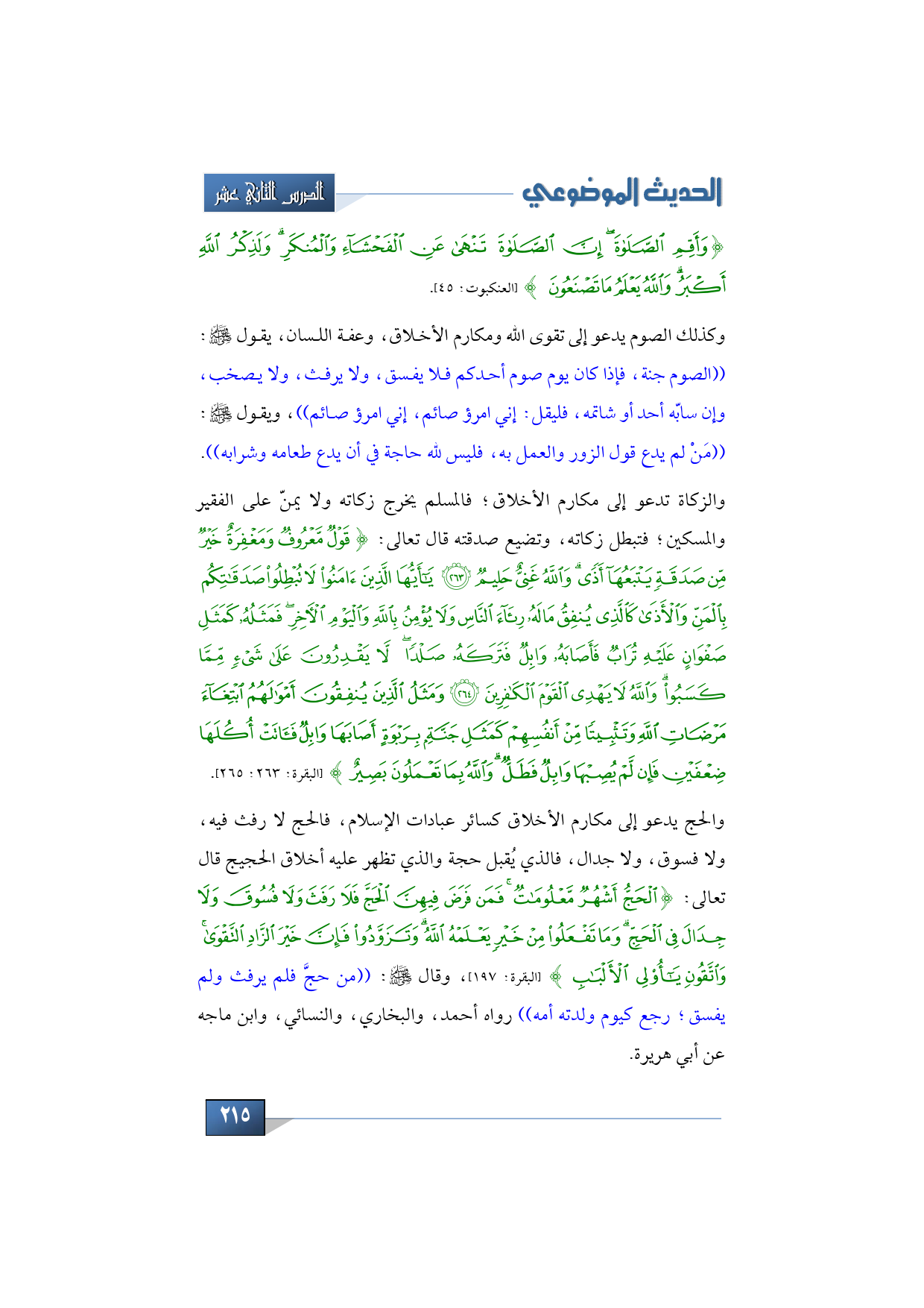 وكذلك الصوم يدعو إلى تقوى الله ومكارم الأخلاق، وعفة اللسان، يقول -صلى الله عليه وسلم: ((الصوم جنة، فإذا كان يوم صوم أحدكم فلا يفسق، ولا يرفث، ولا يصخب، وإن سابّه أحد أو شاتمه، فليقل: إني امرؤ صائم، إني امرؤ صائم))، ويقول -صلى الله عليه وسلم: ((مَنْ لم يدع قول الزور والعمل به، فليس لله حاجة في أن يدع طعامه وشرابه)).