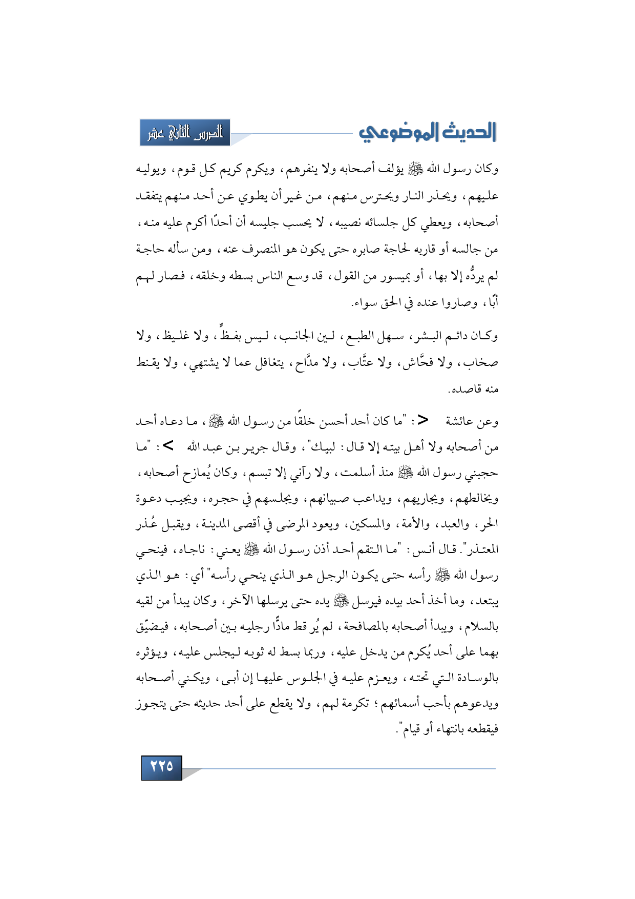 وعن عائشة -رضي الله عنها: "ما كان أحد أحسن خلقًا من رسول الله -صلى الله عليه وسلم، ما دعاه أحد من أصحابه ولا أهل بيته إلا قال: لبيك"، وقال جرير بن عبد الله -رضي الله عنه: "ما حجبني رسول الله -صلى الله عليه وسلم- منذ أسلمت، ولا رآني إلا تبسم، وكان يُمازح أصحابه، ويخالطهم، ويجاريهم، ويداعب صبيانهم، ويجلسهم في حجره، ويجيب دعوة الحر، والعبد، والأمة، والمسكين، ويعود المرضى في أقصى المدينة، ويقبل عُذر المعتذر". قال أنس: "ما التقم أحد أذن رسول الله -صلى الله عليه وسلم- يعني: ناجاه، فينحي رسول الله -صلى الله عليه وسلم- رأسه حتى يكون الرجل هو الذي ينحي رأسه" أي: هو الذي يبتعد، وما أخذ أحد بيده فيرسل -عليه الصلاة والسلام- يده حتى يرسلها الآخر، وكان يبدأ من لقيه بالسلام، ويبدأ أصحابه بالمصافحة، لم يُر قط مادًّا رجليه بين أصحابه، فيضيّق بهما على أحد يُكرم من يدخل عليه، وربما بسط له ثوبه ليجلس عليه، ويؤثره بالوسادة التي تحته، ويعزم عليه في الجلوس عليها إن أبى، ويكني أصحابه ويدعوهم بأحب أسمائهم؛ تكرمة لهم، ولا يقطع على أحد حديثه حتى يتجوز فيقطعه بانتهاء أو قيام".