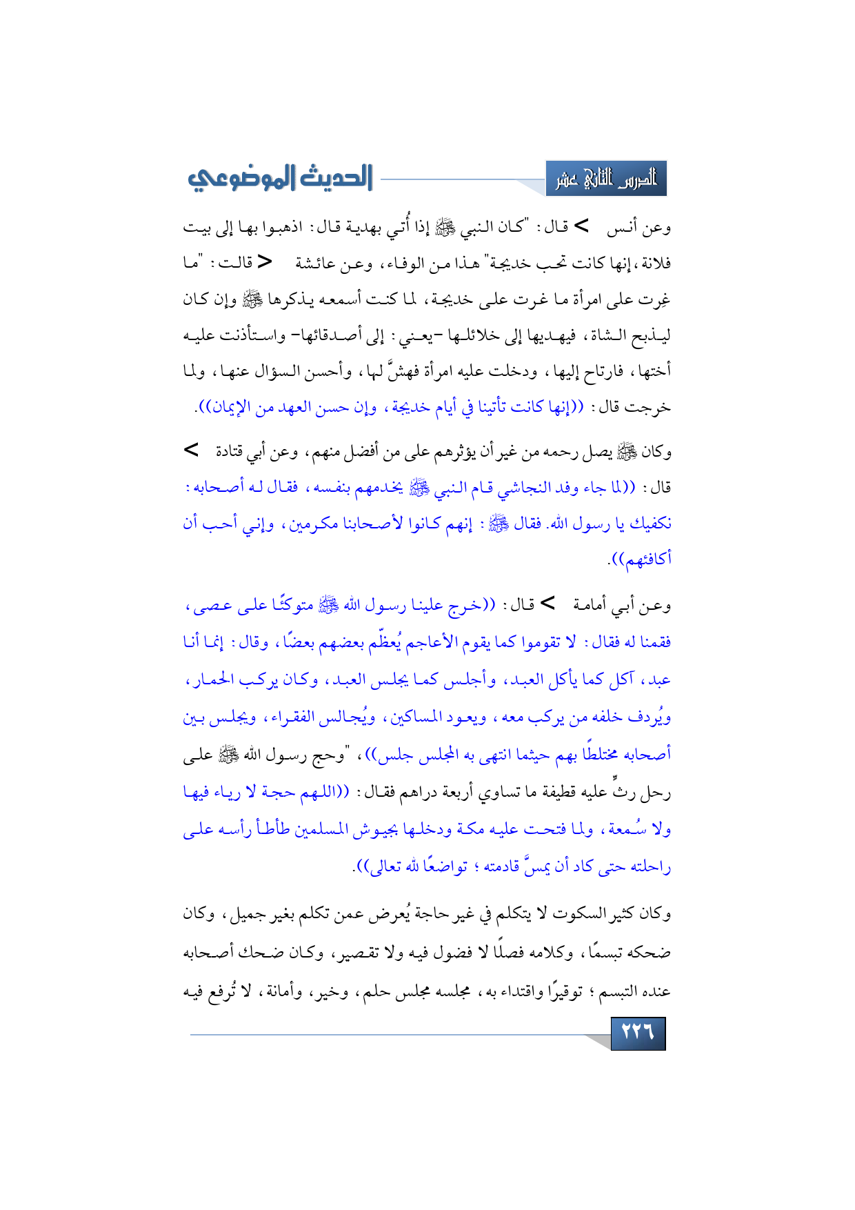 وكان -صلى الله عليه وسلم- يصل رحمه من غير أن يؤثرهم على من أفضل منهم، وعن أبي قتادة -رضي الله عنه- قال: ((لما جاء وفد النجاشي قام النبي -صلى الله عليه وسلم- يخدمهم بنفسه، فقال له أصحابه: نكفيك يا رسول الله. فقال -عليه الصلاة والسلام: إنهم كانوا لأصحابنا مكرمين، وإني أحب أن أكافئهم)).