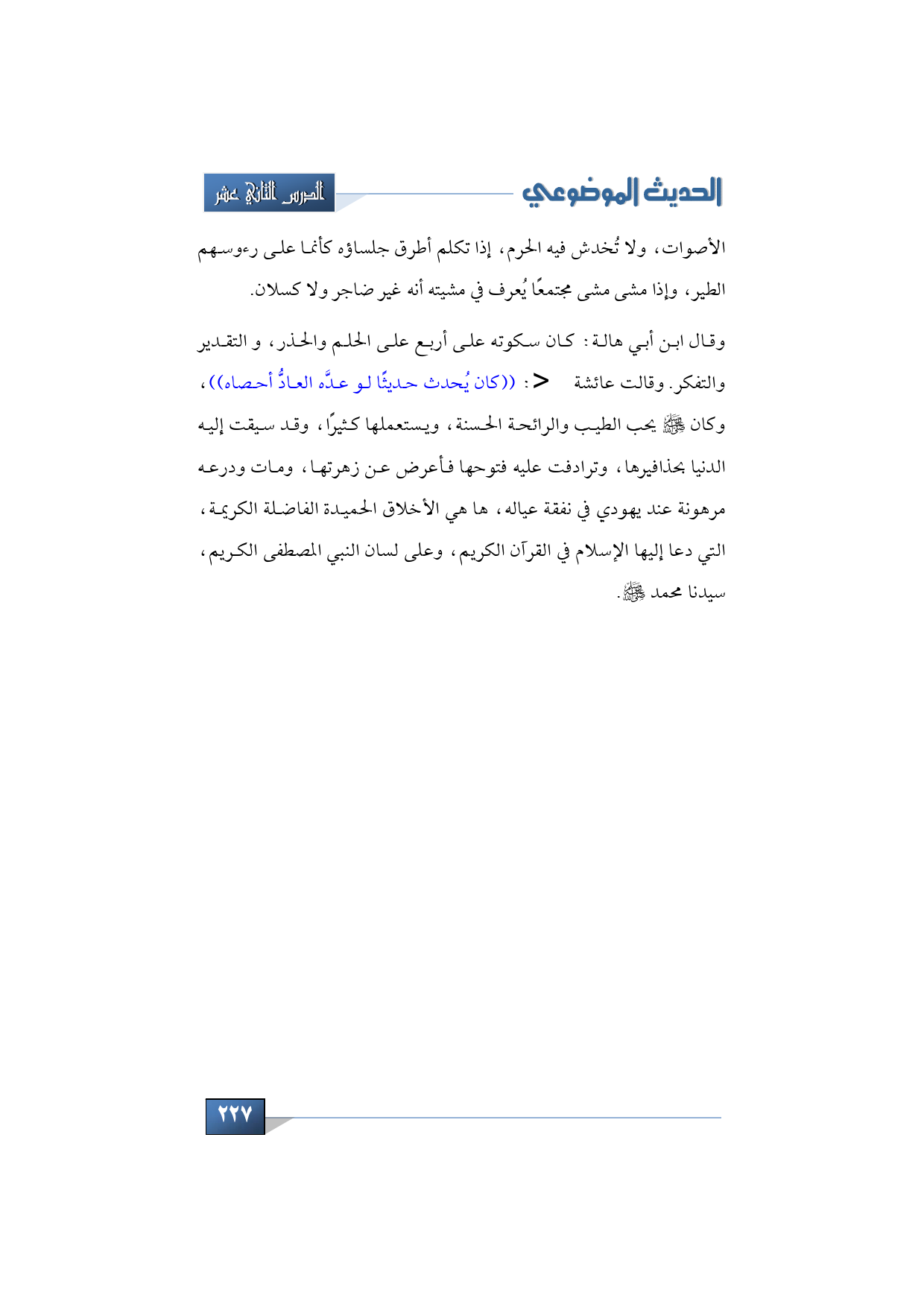 وقال ابن أبي هالة: كان سكوته على أربع على الحلم والحذر، والتقدير والتفكر. وقالت عائشة -رضي الله عنها: ((كان يُحدث حديثًا لو عدَّه العادُّ أحصاه))، وكان -صلى الله عليه وسلم- يحب الطيب والرائحة الحسنة، ويستعملها كثيرًا، وقد سيقت إليه الدنيا بحذافيرها، وترادفت عليه فتوحها فأعرض عن زهرتها، ومات ودرعه مرهونة عند يهودي في نفقة عياله، ها هي الأخلاق الحميدة الفاضلة الكريمة، التي دعا إليها الإسلام في القرآن الكريم، وعلى لسان النبي المصطفى الكريم، سيدنا محمد -صلى الله عليه وسلم.