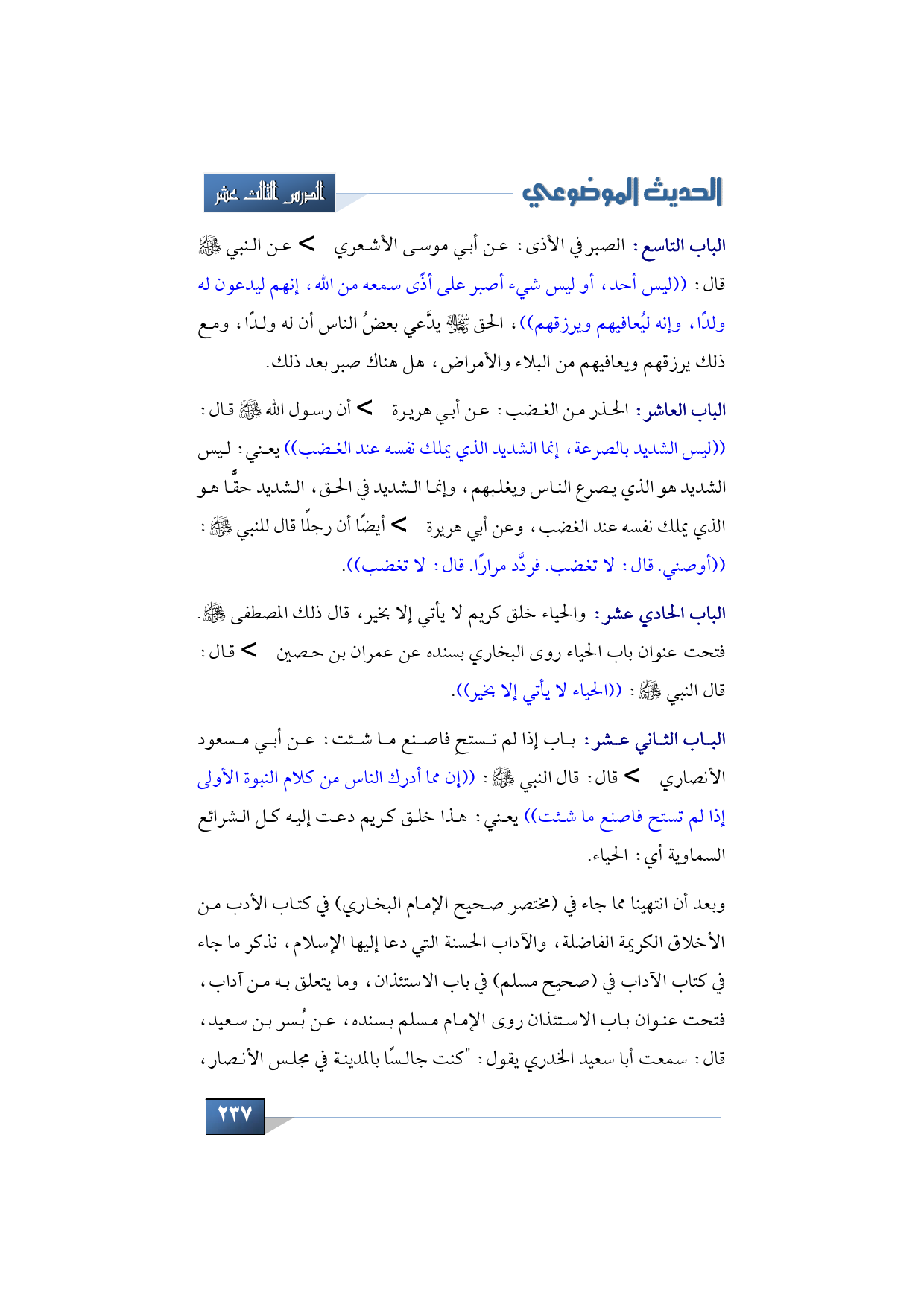 الباب الذي بعد ذلك: باب إذا لم تستحِ فاصنع ما شئت: عن أبي مسعود الأنصاري -رضي الله عنه- قال: قال النبي -صلى الله عليه وسلم: ((إن مما أدرك الناس من كلام النبوة الأولى إذا لم تستح فاصنع ما شئت)) يعني: هذا خلق كريم دعت إليه كل الشرائع السماوية أي: الحياء.
