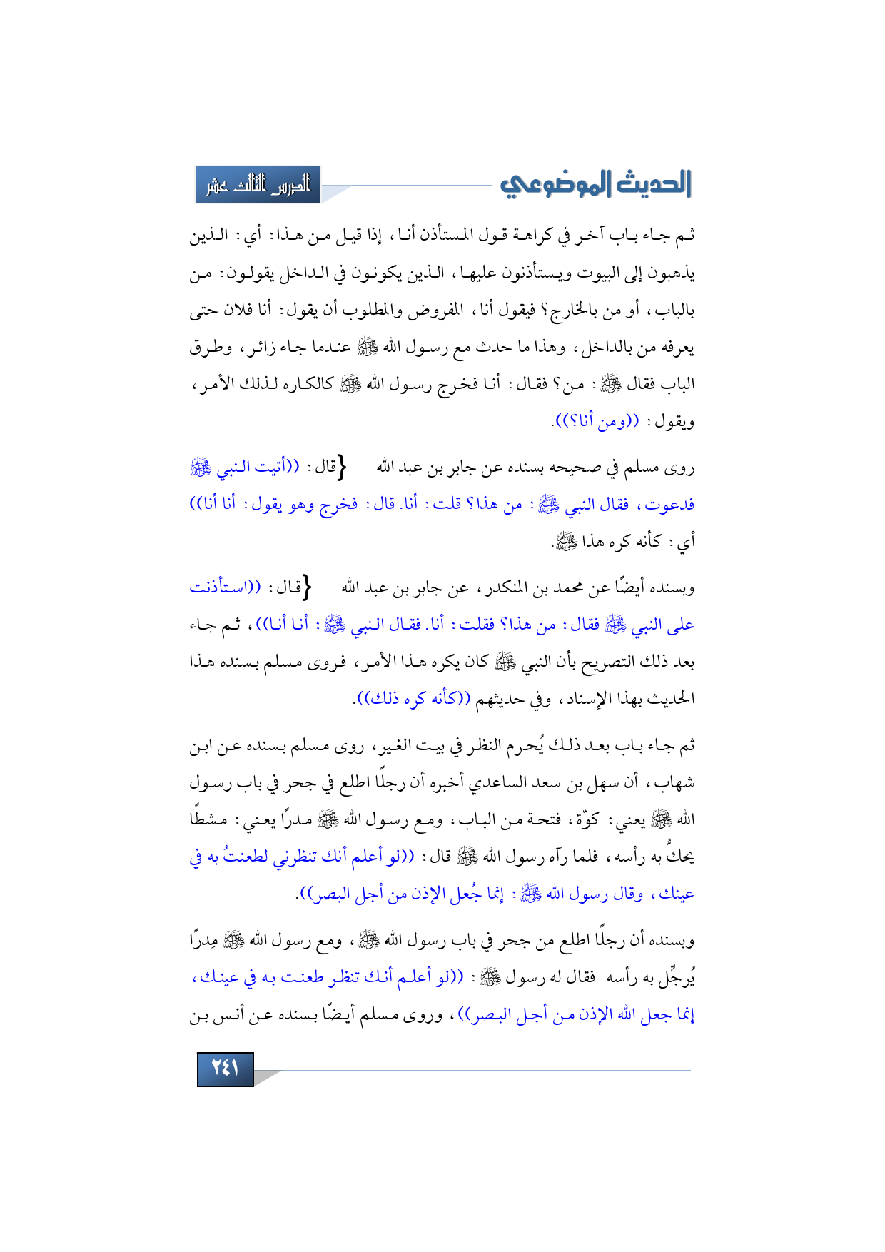 ثم جاء باب بعد ذلك يُحرم النظر في بيت الغير، روى مسلم بسنده عن ابن شهاب، أن سهل بن سعد الساعدي أخبره أن رجلًا اطلع في جحر في باب رسول الله -صلى الله عليه وسلم- يعني: كوّة، فتحة من الباب، ومع رسول الله -صلى الله عليه وسلم- مدرًا يعني: مشطًا يحكُّ به رأسه، فلما رآه رسول الله -صلى الله عليه وسلم- قال: ((لو أعلم أنك تنظرني لطعنتُ به في عينك، وقال رسول الله -صلى الله عليه وسلم: إنما جُعل الإذن من أجل البصر)).