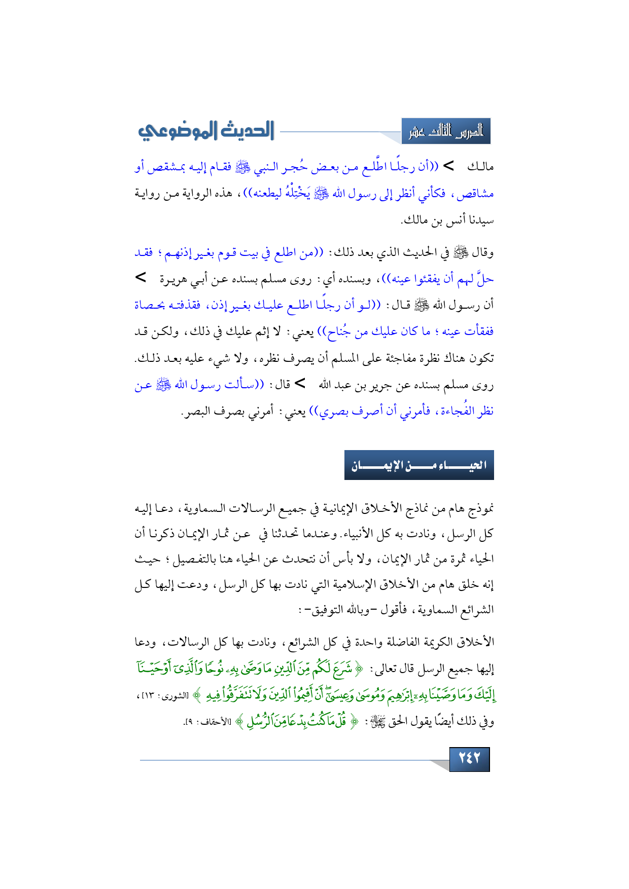 وقال -صلى الله عليه وسلم- في الحديث الذي بعد ذلك: ((من اطلع في بيت قوم بغير إذنهم؛ فقد حلَّ لهم أن يفقئوا عينه))، وبسنده أي: روى مسلم بسنده عن أبي هريرة -رضي الله عنه- أن رسول الله -صلى الله عليه وسلم- قال: ((لو أن رجلًا اطلع عليك بغير إذن، فقذفته بحصاة ففقأت عينه؛ ما كان عليك من جُناح)) يعني: لا إثم عليك في ذلك، ولكن قد تكون هناك نظرة مفاجئة على المسلم أن يصرف نظره، ولا شيء عليه بعد ذلك. روى مسلم بسنده عن جرير بن عبد الله -رضي الله عنه- قال: ((سألت رسول الله -صلى الله عليه وسلم- عن نظر الفُجاءة، فأمرني أن أصرف بصري)) يعني: أمرني بصرف البصر.