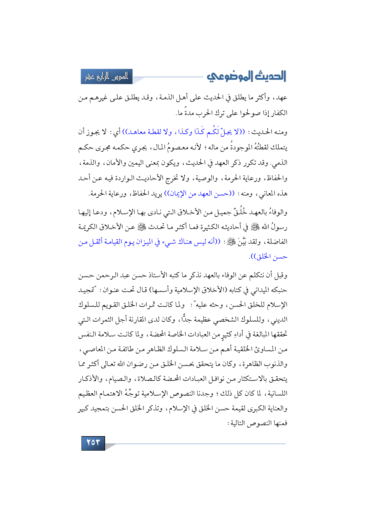 وقبل أن نتكلم عن الوفاء بالعهد نذكر ما كتبه الأستاذ حسن عبد الرحمن حسن حنبكه الميداني في كتابه (الأخلاق الإسلامية وأسسها) قال تحت عنوان: "تمجيد الإسلام للخلق الحسن، وحثه عليه": ولما كانت ثمرات الخلق القويم للسلوك الديني، وللسلوك الشخصي عظيمة جدًّا، وكان لدى المقارنة أجل الثمرات التي تحققها المبالغة في أداءِ كثيرٍ من العبادات الخاصة المحضة، ولما كانت سلامة النفس من المساوئ الخلقية أهم من سلامة السلوك الظاهر من طائفة من المعاصي، والذنوب الظاهرة، وكان ما يتحقق بحسن الخلق من رضوان الله تعالى أكثر مما يتحقق بالاستكثار من نوافل العبادات المحضة كالصلاة، والصيام، والأذكار اللسانية، لما كان كل ذلك؛ وجدنا النصوص الإسلامية توجِّهُ الاهتمام العظيم والعناية الكبرى لقيمة حسن الخلق في الإسلام، وتذكر الخلق الحسن بتمجيد كبير فمنها النصوص التالية: