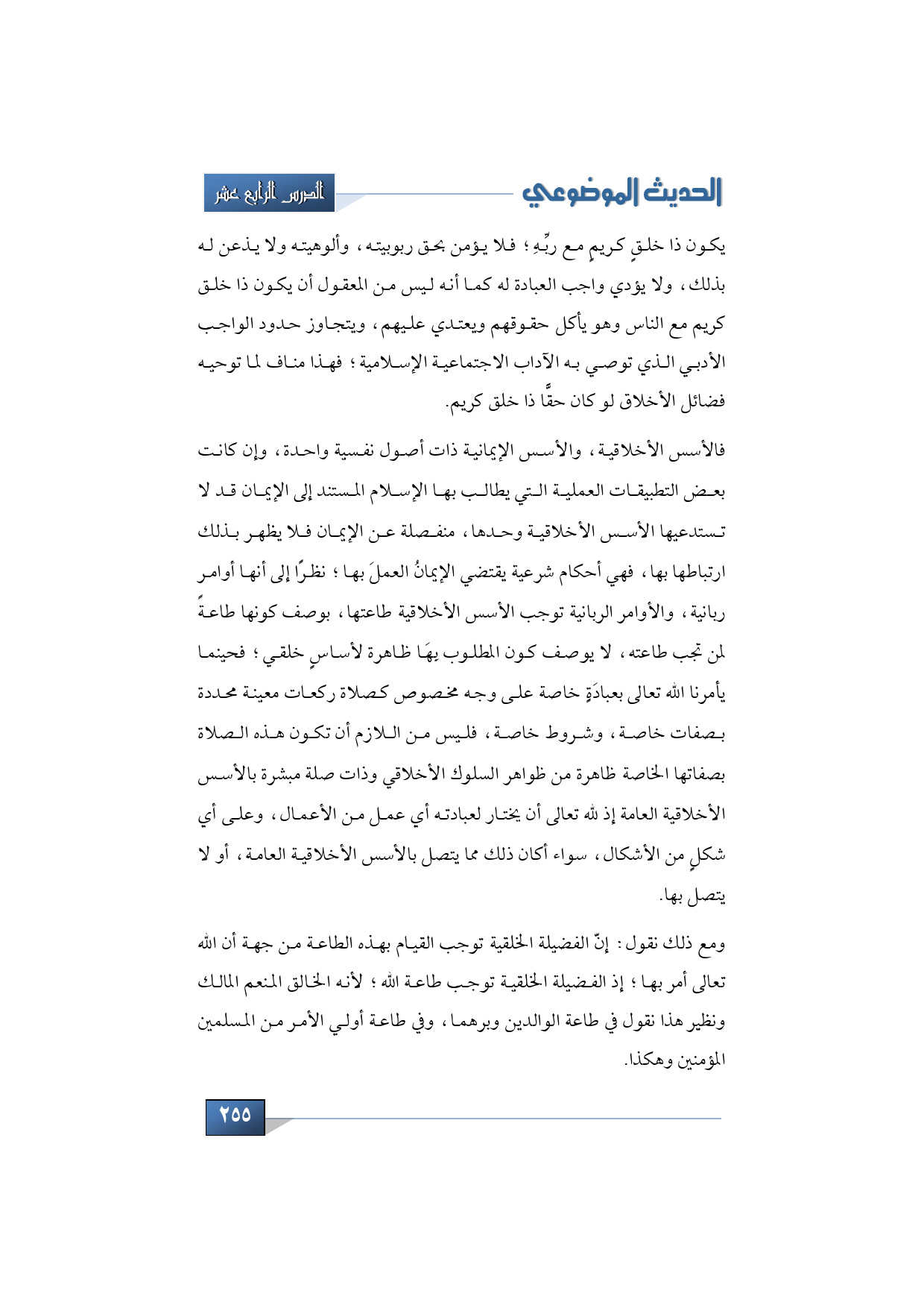 ومع ذلك نقول: إنّ الفضيلة الخلقية توجب القيام بهذه الطاعة من جهة أن الله تعالى أمر بها؛ إذ الفضيلة الخلقية توجب طاعة الله؛ لأنه الخالق المنعم المالك ونظير هذا نقول في طاعة الوالدين وبرهما، وفي طاعة أولي الأمر من المسلمين المؤمنين وهكذا.