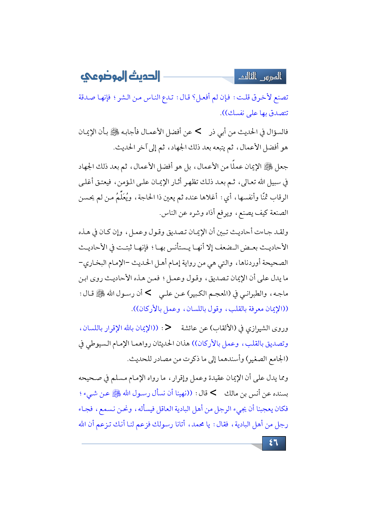 ومما يدل على أن الإيمان عقيدة وعمل وإقرار، ما رواه الإمام مسلم في صحيحه بسنده عن أنس بن مالك -رضي الله عنه- قال: ((نهينا أن نسأل رسول الله -صلى الله عليه وسلم- عن شيء؛ فكان يعجبنا أن يجيء الرجل من أهل البادية العاقل فيسأله، ونحن نسمع، فجاء رجل من أهل البادية، فقال: يا محمد، أتانا رسولك فزعم لنا أنك تزعم أن الله
