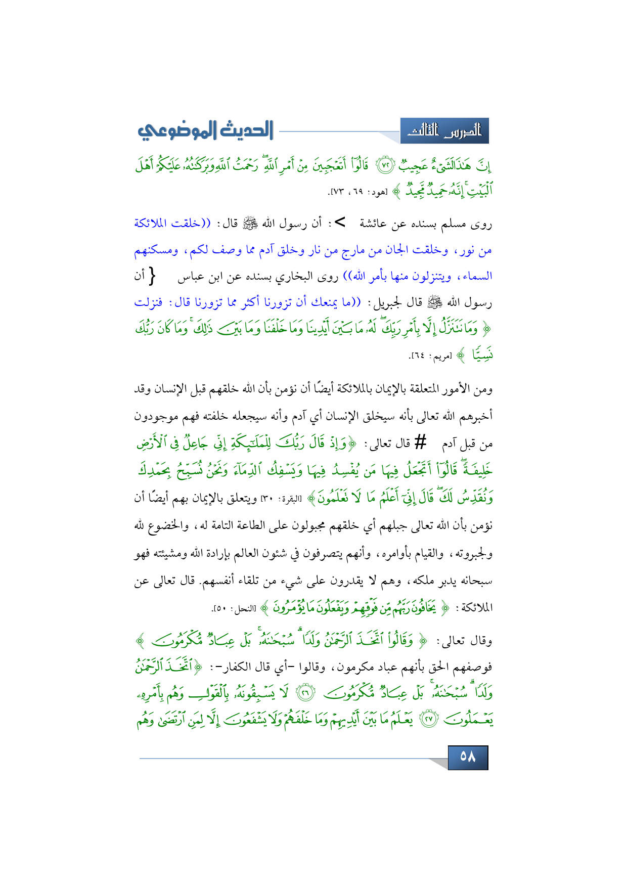 روى مسلم بسنده عن عائشة -رضي الله عنه-: أن رسول الله -صلى الله عليه وسلم- قال: ((خلقت الملائكة من نور، وخلقت الجان من مارج من نار وخلق آدم مما وصف لكم، ومسكنهم السماء، ويتنزلون منها بأمر الله)) روى البخاري بسنده عن ابن عباس -رضي الله عنهما- أن رسول الله -صلى الله عليه وسلم- قال لجبريل: ((ما يمنعك أن تزورنا أكثر مما تزورنا قال: فنزلت {وَمَا نَتَنَزَّلُ إِلاَّ بِأَمْرِ رَبِّكَ لَهُ مَا بَيْنَ أَيْدِينَا وَمَا خَلْفَنَا وَمَا بَيْنَ ذَلِكَ وَمَا كَانَ رَبُّكَ نَسِيًّا} (مريم: 64).