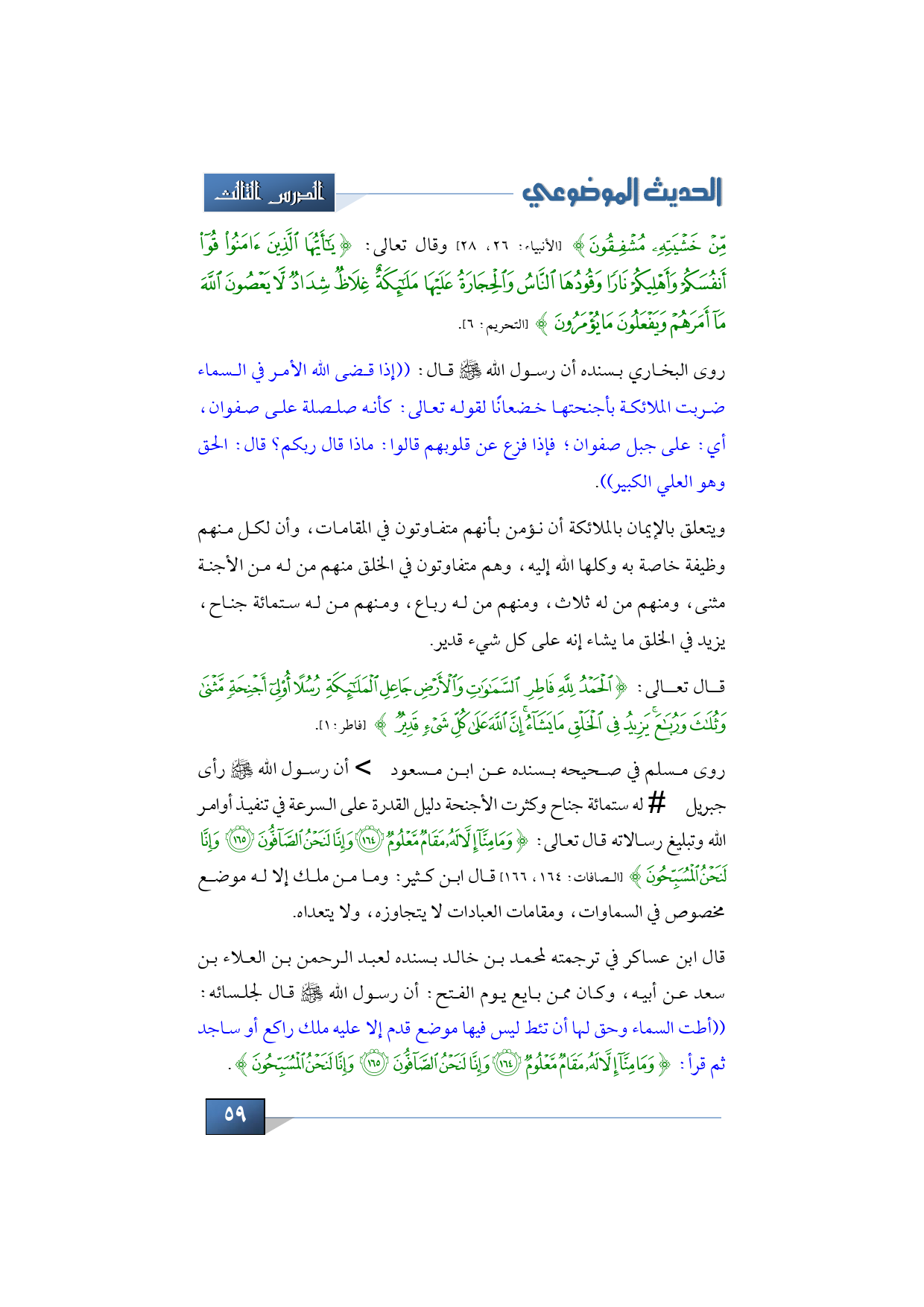 مِنْ خَشْيَتِهِ مُشْفِقُونَ} (الأنبياء: 26، 28) وقال تعالى: {يَا أَيُّهَا الَّذِينَ آمَنُوا قُوا أَنفُسَكُمْ وَأَهْلِيكُمْ نَارًا وَقُودُهَا النَّاسُ وَالْحِجَارَةُ عَلَيْهَا مَلائِكَةٌ غِلاظٌ شِدَادٌ لا يَعْصُونَ اللَّهَ مَا أَمَرَهُمْ وَيَفْعَلُونَ مَا يُؤْمَرُونَ}.