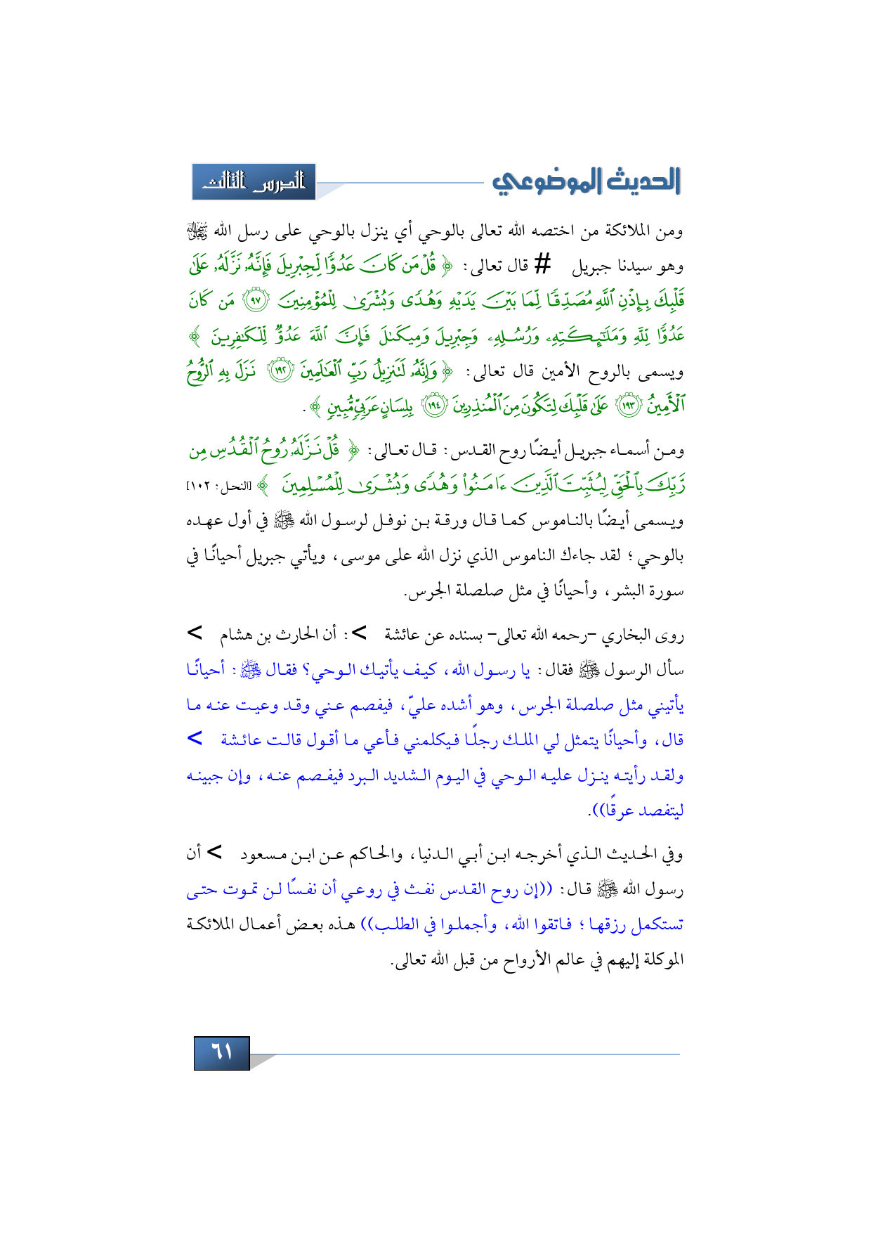 ومن الملائكة من اختصه الله تعالى بالوحي أي ينزل بالوحي على رسل الله -سبحانه وتعالى- وهو سيدنا جبريل -عليه السلام- قال تعالى: {قُلْ مَنْ كَانَ عَدُوًّا لِجِبْرِيلَ فَإِنَّهُ نَزَّلَهُ عَلَى قَلْبِكَ بِإِذْنِ اللَّهِ مُصَدِّقًا لِمَا بَيْنَ يَدَيْهِ وَهُدًى وَبُشْرَى لِلْمُؤْمِنِينَ * مَنْ كَانَ عَدُوًّا لِلَّهِ وَمَلائِكَتِهِ وَرُسُلِهِ وَجِبْرِيلَ وَمِيكَالَ فَإِنَّ اللَّهَ عَدُوٌّ لِلْكَافِرِينَ} ويسمى بالروح الأمين قال تعالى: {وَإِنَّهُ لَتَنْزِيلُ رَبِّ الْعَالَمِينَ * نَزَلَ بِهِ الرُّوحُ الأَمِينُ * عَلَى قَلْبِكَ لِتَكُونَ مِنْ الْمُنذِرِينَ * بِلِسَانٍ عَرَبِيٍّ مُبِينٍ}.