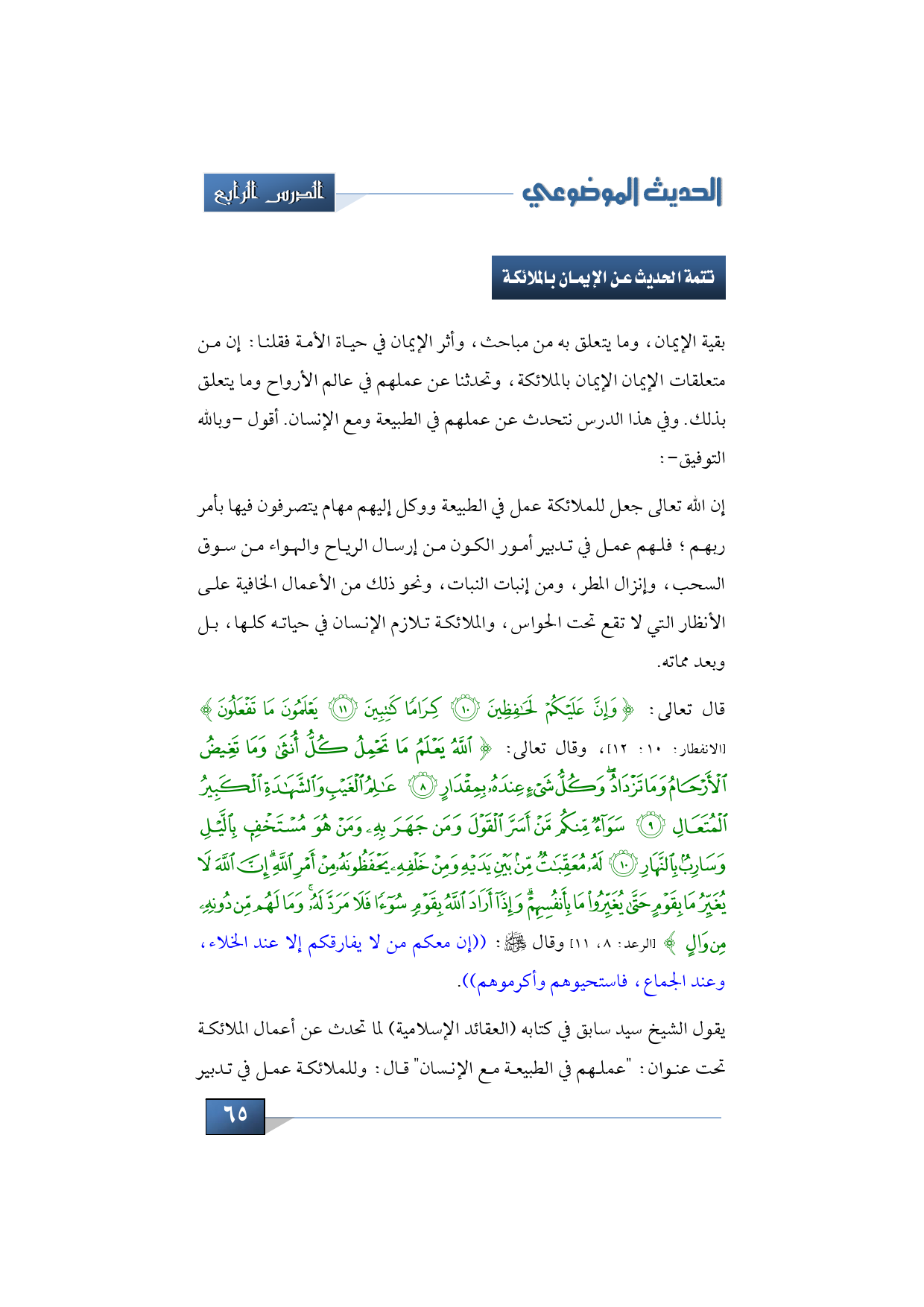 بقية الإيمان، وما يتعلق به من مباحث، وأثر الإيمان في حياة الأمة فقلنا: إن من متعلقات الإيمان الإيمان بالملائكة، وتحدثنا عن عملهم في عالم الأرواح وما يتعلق بذلك. وفي هذا الدرس نتحدث عن عملهم في الطبيعة ومع الإنسان. أقول -وبالله التوفيق-: