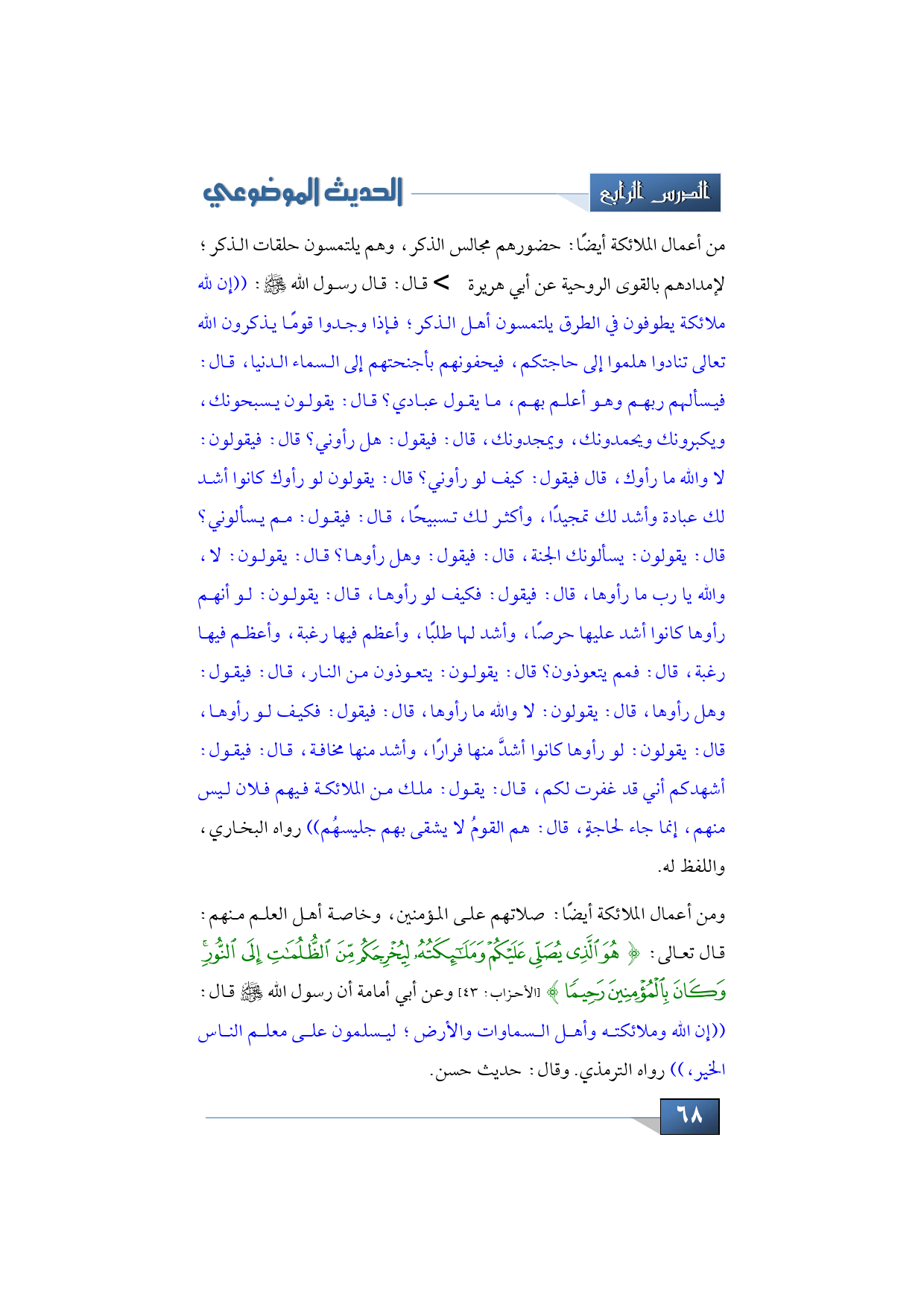 من أعمال الملائكة أيضًا: حضورهم مجالس الذكر، وهم يلتمسون حلقات الذكر؛ لإمدادهم بالقوى الروحية عن أبي هريرة -رضي الله عنه- قال: قال رسول الله -صلى الله عليه وسلم-: ((إن لله ملائكة يطوفون في الطرق يلتمسون أهل الذكر؛ فإذا وجدوا قومًا يذكرون الله تعالى تنادوا هلموا إلى حاجتكم، فيحفونهم بأجنحتهم إلى السماء الدنيا، قال: فيسألهم ربهم وهو أعلم بهم، ما يقول عبادي؟ قال: يقولون يسبحونك، ويكبرونك ويحمدونك، ويمجدونك، قال: فيقول: هل رأوني؟ قال: فيقولون: لا والله ما رأوك، قال فيقول: كيف لو رأوني؟ قال: يقولون لو رأوك كانوا أشد لك عبادة وأشد لك تمجيدًا، وأكثر لك تسبيحًا، قال: فيقول: مم يسألوني؟ قال: يقولون: يسألونك الجنة، قال: فيقول: وهل رأوها؟ قال: يقولون: لا، والله يا رب ما رأوها، قال: فيقول: فكيف لو رأوها، قال: يقولون: لو أنهم رأوها كانوا أشد عليها حرصًا، وأشد لها طلبًا، وأعظم فيها رغبة، وأعظم فيها رغبة، قال: فمم يتعوذون؟ قال: يقولون: يتعوذون من النار، قال: فيقول: وهل رأوها، قال: يقولون: لا والله ما رأوها، قال: فيقول: فكيف لو رأوها، قال: يقولون: لو رأوها كانوا أشدَّ منها فرارًا، وأشد منها مخافة، قال: فيقول: أشهدكم أني قد غفرت لكم، قال: يقول: ملك من الملائكة فيهم فلان ليس منهم، إنما جاء لحاجةٍ، قال: هم القومُ لا يشقى بهم جليسهُم)) رواه البخاري، واللفظ له.