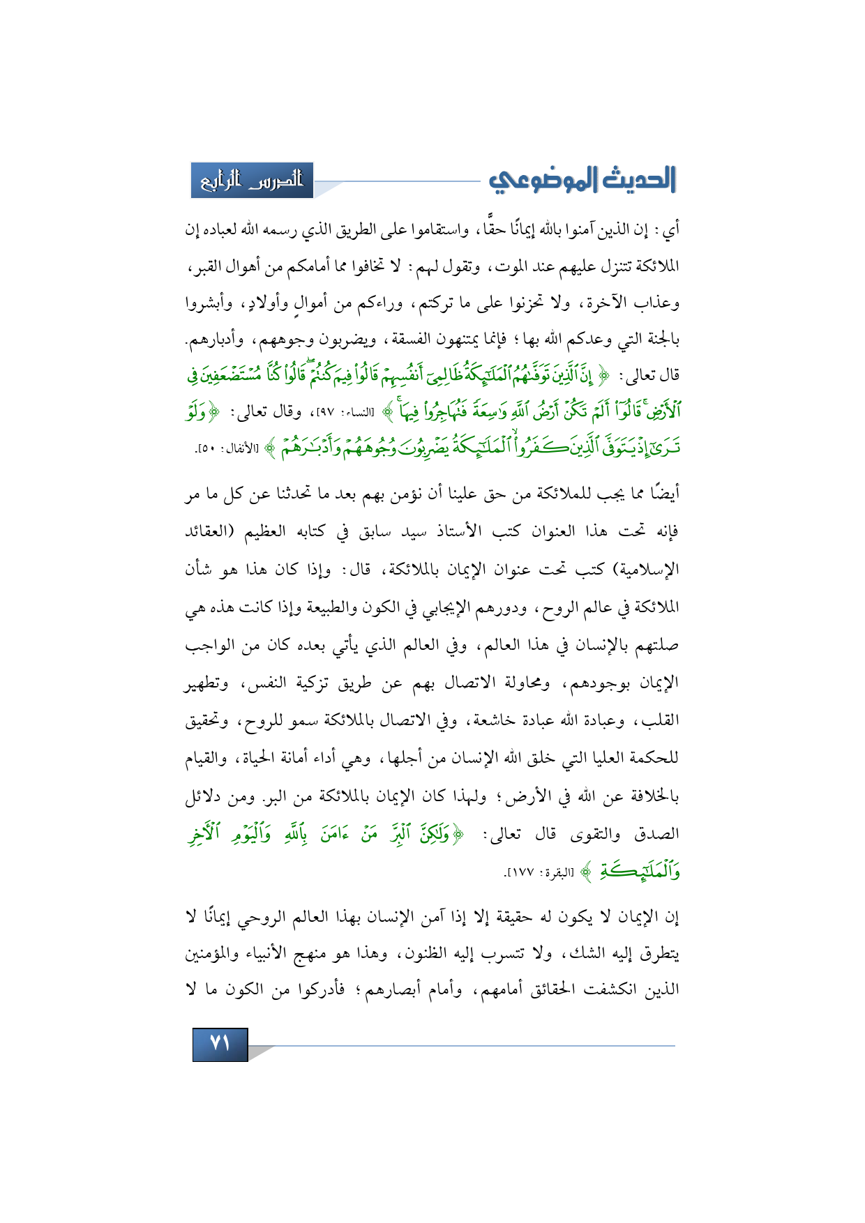 أيضًا مما يجب للملائكة من حق علينا أن نؤمن بهم بعد ما تحدثنا عن كل ما مر فإنه تحت هذا العنوان كتب الأستاذ سيد سابق في كتابه العظيم (العقائد الإسلامية) كتب تحت عنوان الإيمان بالملائكة، قال: وإذا كان هذا هو شأن الملائكة في عالم الروح، ودورهم الإيجابي في الكون والطبيعة وإذا كانت هذه هي صلتهم بالإنسان في هذا العالم، وفي العالم الذي يأتي بعده كان من الواجب الإيمان بوجودهم، ومحاولة الاتصال بهم عن طريق تزكية النفس، وتطهير القلب، وعبادة الله عبادة خاشعة، وفي الاتصال بالملائكة سمو للروح، وتحقيق للحكمة العليا التي خلق الله الإنسان من أجلها، وهي أداء أمانة الحياة، والقيام بالخلافة عن الله في الأرض؛ ولهذا كان الإيمان بالملائكة من البر. ومن دلائل الصدق والتقوى قال تعالى: {وَلَكِنَّ الْبِرَّ مَنْ آمَنَ بِاللَّهِ وَالْيَوْمِ الآخِرِ وَالْمَلائِكَةِ} (البقرة: 177).