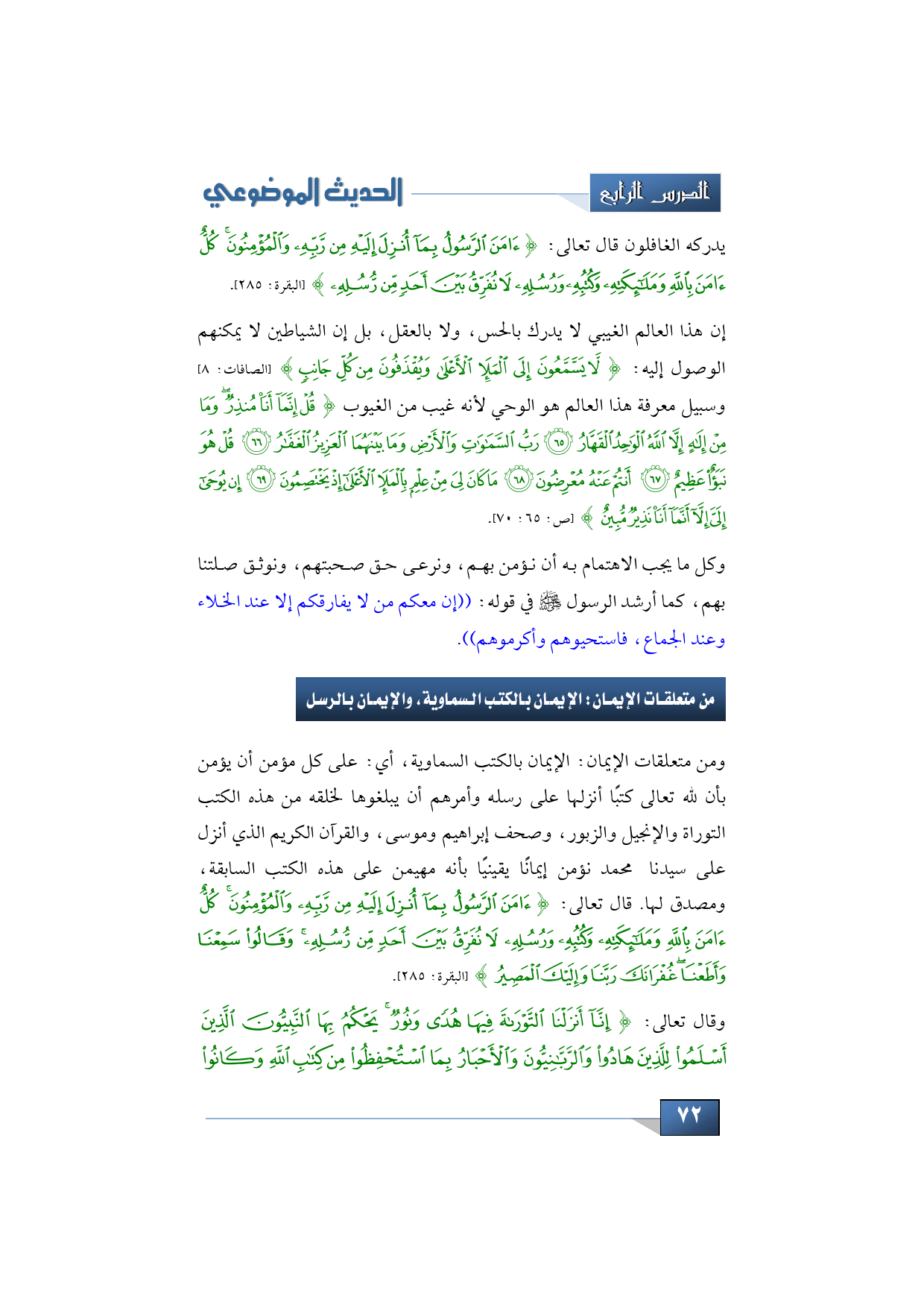 من متعلقات الإيمان: الإيمان بالكتب السماوية، والإيمان بالرسل
