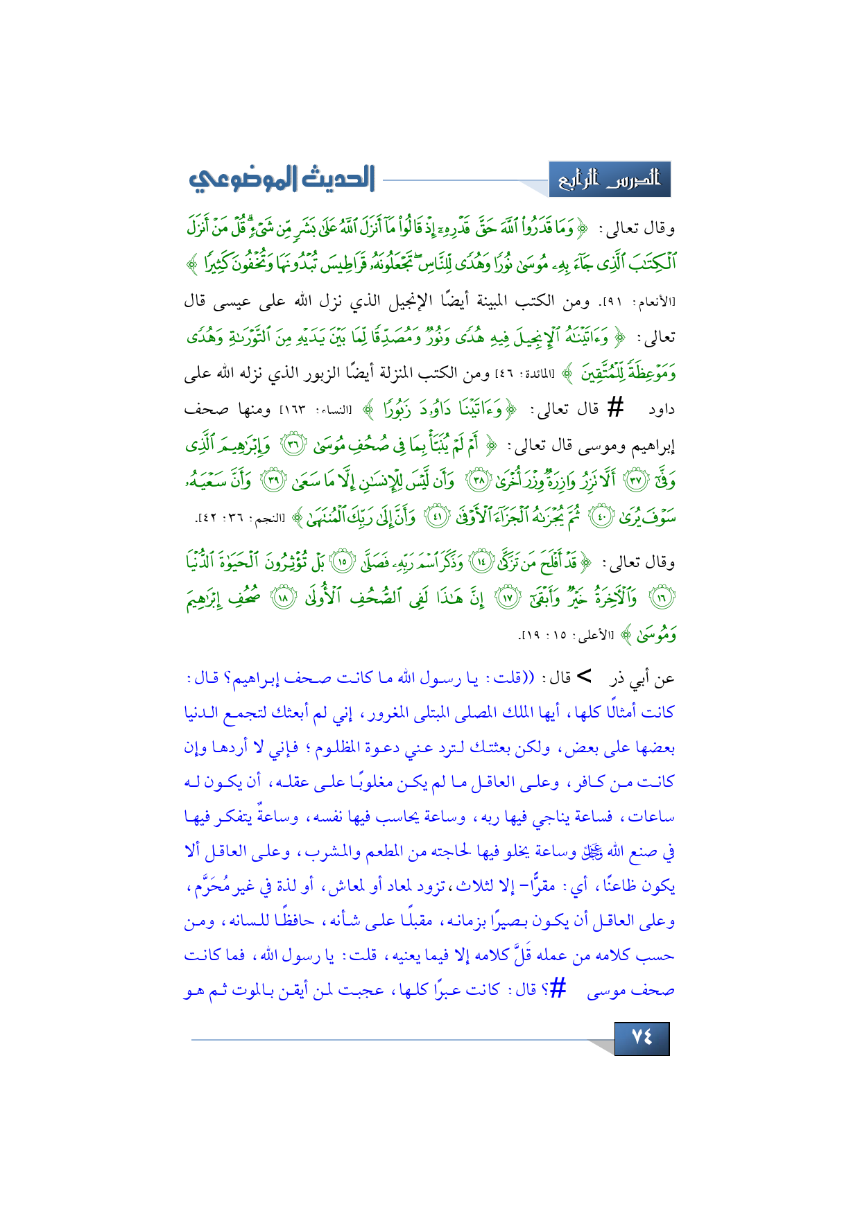 عن أبي ذر -رضي الله عنه- قال: ((قلت: يا رسول الله 31:16ما كانت صحف ما كانت صحف إبراهيم؟ قال: كانت أمثالًا كلها، أيها الملك المصلى المبتلى المغرور، إني لم أبعثك لتجمع الدنيا بعضها على بعض، ولكن بعثتك لترد عني دعوة المظلوم؛ فإني لا أردها وإن كانت من كافر، وعلى العاقل ما لم يكن مغلوبًا على عقله، أن يكون له ساعات، فساعة يناجي فيها ربه، وساعة يحاسب فيها نفسه، وساعةٌ يتفكر فيها في صنع الله -عز وجل- وساعة يخلو فيها لحاجته من المطعم والمشرب، وعلى العاقل ألا يكون ظاعنًا، أي: مقرًّا- إلا لثلاث، تزود لمعاد أو لمعاش، أو لذة في غير مُحَرَّم، وعلى العاقل أن يكون بصيرًا بزمانه، مقبلًا على شأنه، حافظًا للسانه، ومن حسب كلامه من عمله قَلَّ كلامه إلا فيما يعنيه، قلت: يا رسول الله، فما كانت صحف موسى -عليه السلام-؟ قال: كانت عبرًا كلها، عجبت لمن أيقن بالموت ثم هو
