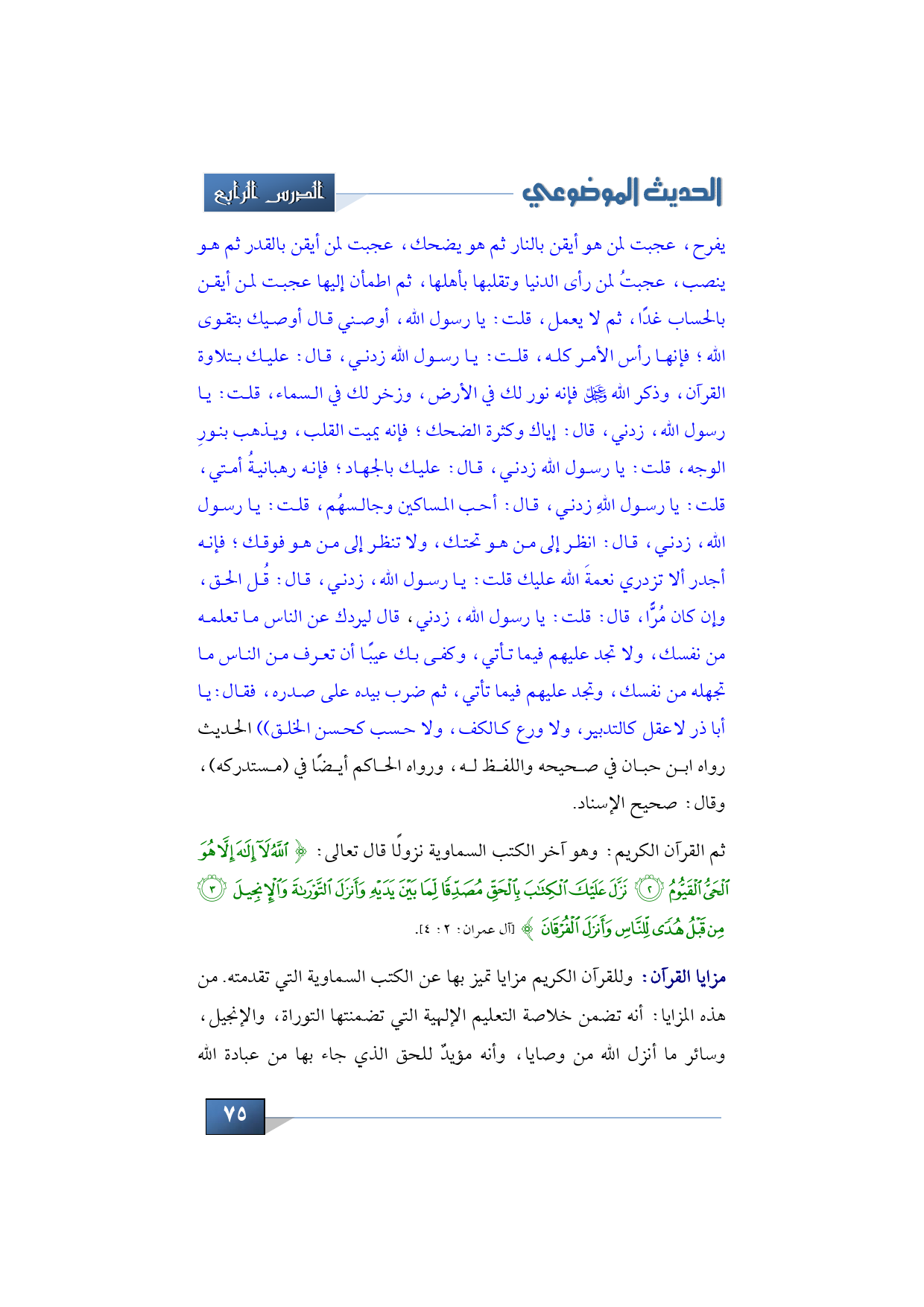 يفرح، عجبت لمن هو أيقن بالنار ثم هو يضحك، عجبت لمن أيقن بالقدر ثم هو ينصب، عجبتُ لمن رأى الدنيا وتقلبها بأهلها، ثم اطمأن إليها عجبت لمن أيقن بالحساب غدًا، ثم لا يعمل، قلت: يا رسول الله، أوصني قال أوصيك بتقوى الله؛ فإنها رأس الأمر كله، قلت: يا رسول الله زدني، قال: عليك بتلاوة القرآن، وذكر الله -عز وجل- فإنه نور لك في الأرض، وزخر لك في السماء، قلت: يا رسول الله، زدني، قال: إياك وكثرة الضحك؛ فإنه يميت القلب، ويذهب بنورِ الوجه، قلت: يا رسول الله زدني، قال: عليك بالجهاد؛ فإنه رهبانيةُ أمتي، قلت: يا رسول اللهِ زدني، قال: أحب المساكين وجالسهُم، قلت: يا رسول الله، زدني، قال: انظر إلى من هو تحتك، ولا تنظر إلى من هو فوقك؛ فإنه أجدر ألا تزدري نعمةَ الله عليك قلت: يا رسول الله، زدني، قال: قُل الحق، وإن كان مُرًّا، قال: قلت: يا رسول الله، زدني، قال ليردك عن الناس ما تعلمه من نفسك، ولا تجد عليهم فيما تأتي، وكفى بك عيبًا أن تعرف من الناس ما تجهله من نفسك، وتجد عليهم فيما تأتي، ثم ضرب بيده على صدره، فقال: يا أبا ذر لاعقل كالتدبير، ولا ورع كالكف، ولا حسب كحسن الخلق)) الحديث رواه ابن حبان في صحيحه واللفظ له، ورواه الحاكم أيضًا في (مستدركه)، وقال: صحيح الإسناد.