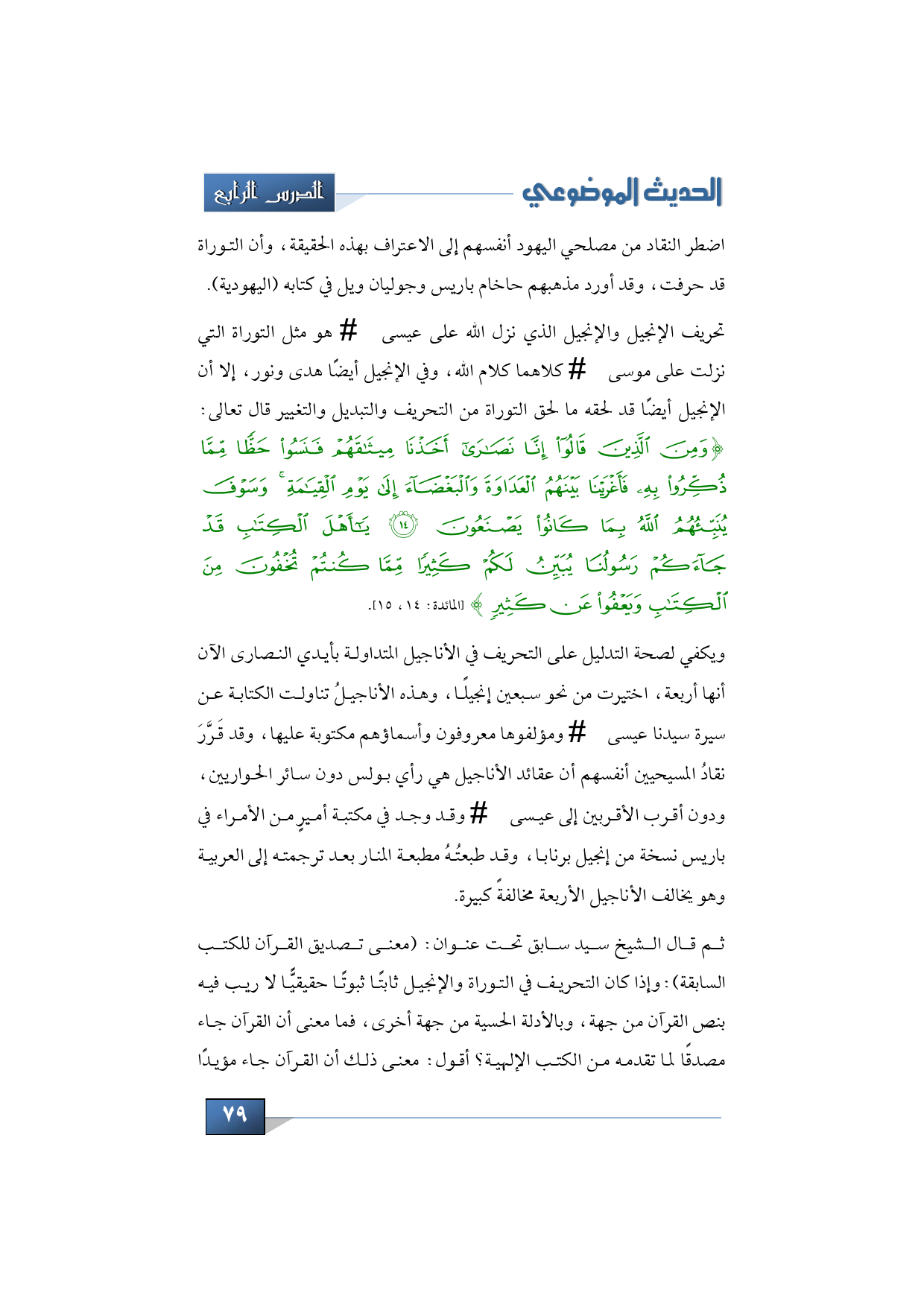 تحريف الإنجيل والإنجيل الذي نزل الله على عيسى -عليه السلام- هو مثل التوراة التي نزلت على موسى -عليه السلام- كلاهما كلام الله، وفي الإنجيل أيضًا هدى ونور، إلا أن الإنجيل أيضًا قد لحقه ما لحق التوراة من التحريف والتبديل والتغيير قال تعالى: {وَمِنْ الَّذِينَ قَالُوا إِنَّا نَصَارَى أَخَذْنَا مِيثَاقَهُمْ فَنَسُوا حَظًّا مِمَّا ذُكِّرُوا بِهِ فَأَغْرَيْنَا بَيْنَهُمْ الْعَدَاوَةَ وَالْبَغْضَاءَ إِلَى يَوْمِ الْقِيَامَةِ وَسَوْفَ يُنَبِّئُهُمْ اللَّهُ بِمَا كَانُوا يَصْنَعُونَ * يَا أَهْلَ الْكِتَابِ قَدْ جَاءَكُمْ رَسُولُنَا يُبَيِّنُ لَكُمْ كَثِيرًا مِمَّا كُنْتُمْ تُخْفُونَ مِنْ الْكِتَابِ وَيَعْفُو عَنْ كَثِيرٍ} (المائدة: 14، 15).