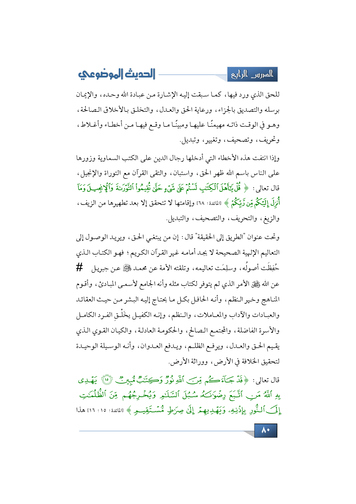 وتحت عنوان "الطريق إلى الحقيقة" قال: إن من يبتغي الحق، ويريد الوصول إلى التعاليم الإلهية الصحيحة لا يجد أمامه غير القرآن الكريم؛ فهو الكتاب الذي حُفِظَت أصولُه، وسلِمَت تعاليمه، وتلقته الأمة عن محمد -صلى الله عليه وسلم- عن جبريل -عليه السلام- عن الله -عز وجل- الأمر الذي لم يتوفر لكتاب مثله وأنه الجامع لأسمى المبادئ، وأقوم المناهج وخير النظم، وأنه الحافل بكل ما يحتاج إليه البشر من حيث العقائد والعبادات والآداب والمعاملات، والنظم، وإنه الكفيل بِخَلْقِ الفرد الكامل والأسرة الفاضلة، والمجتمع الصالح، والحكومة العادلة، والكيان القوي الذي يقيم الحق والعدل، ويرفع الظلم، ويدفع العدوان، وأنه الوسيلة الوحيدة لتحقيق الخلافة في الأرض، ووراثة الأرض.