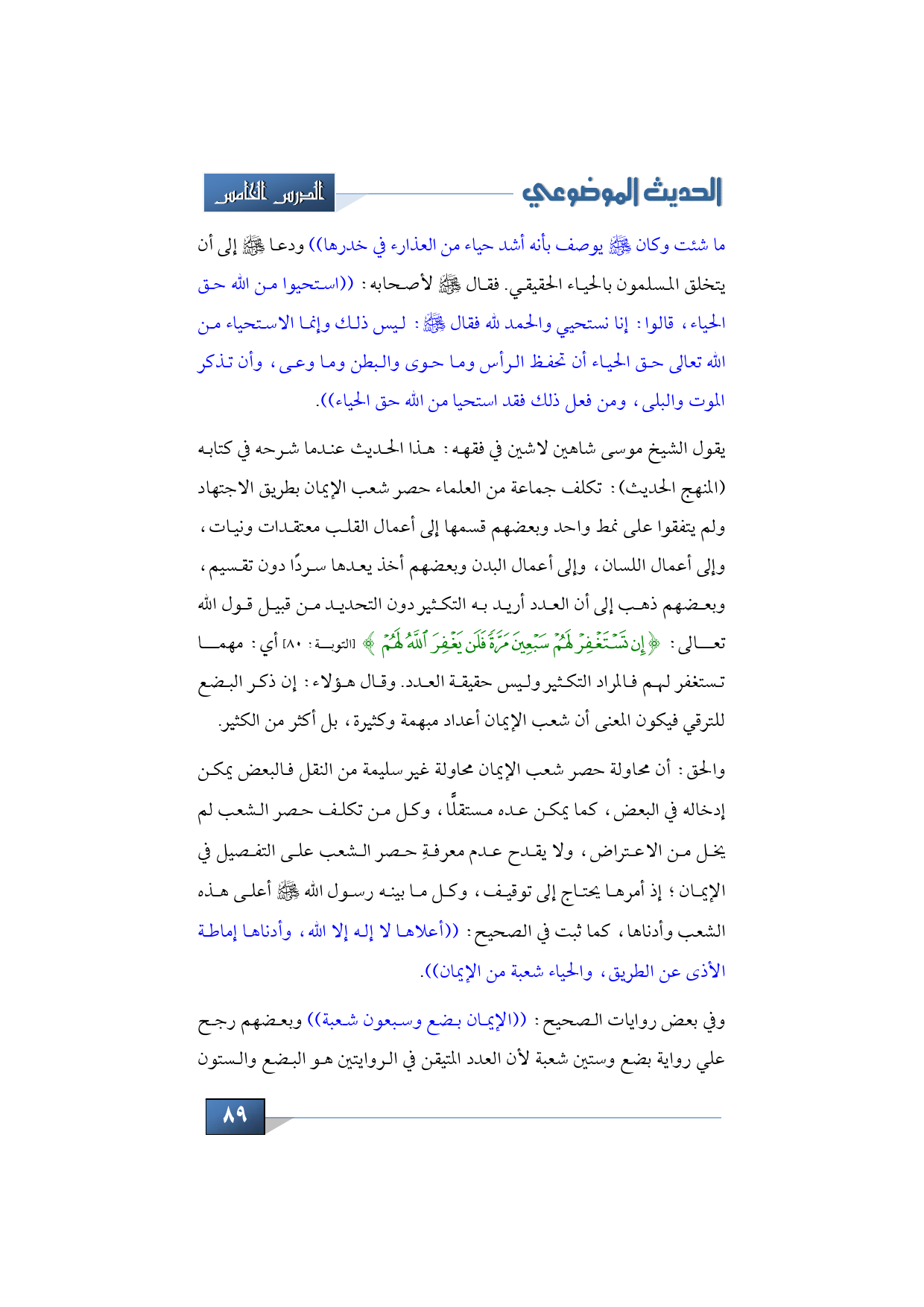 وفي بعض روايات الصحيح: ((الإيمان بضع وسبعون شعبة)) وبعضهم رجح علي رواية بضع وستين شعبة لأن العدد المتيقن في الروايتين هو البضع والستون