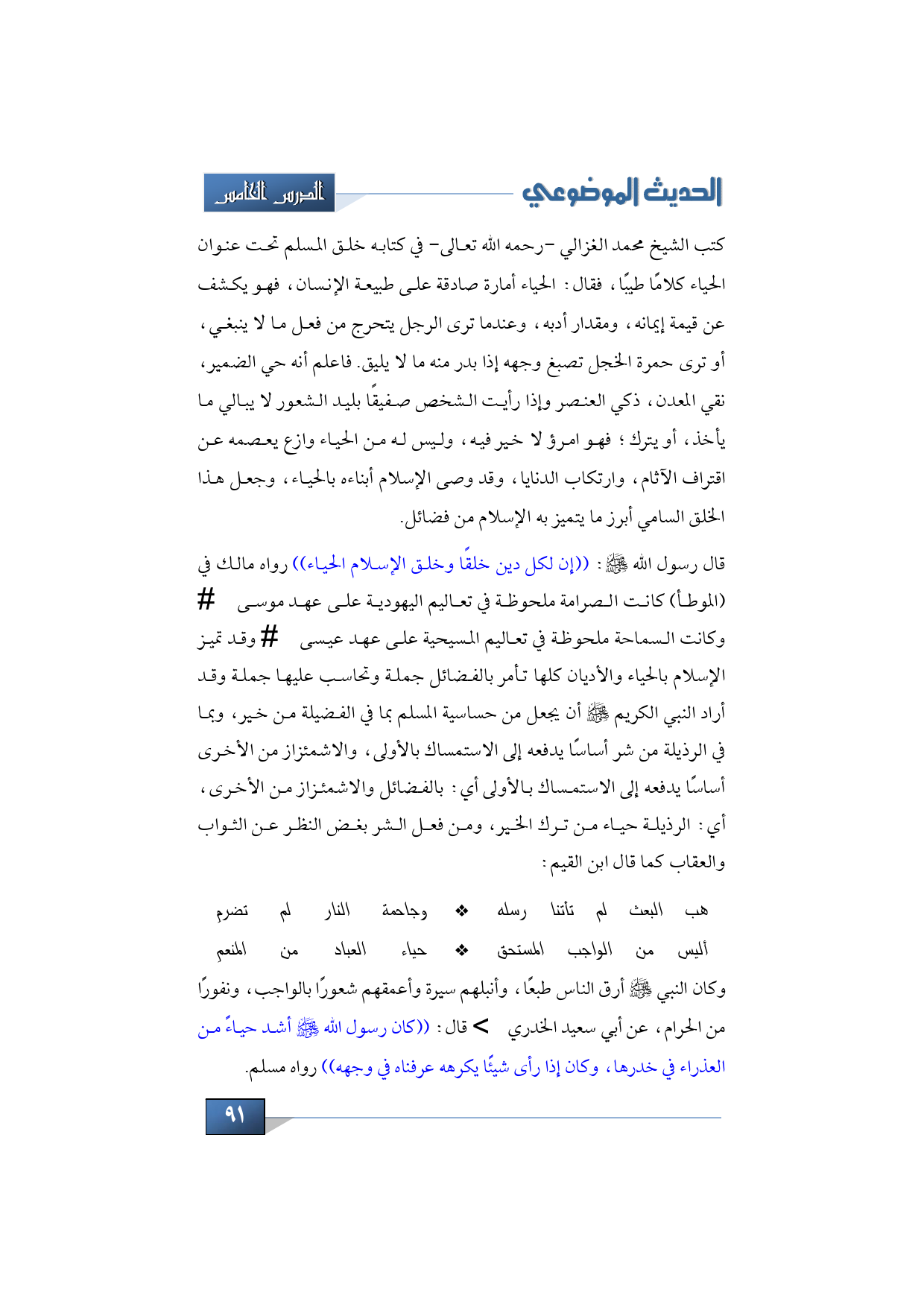 قال رسول الله -صلى الله عليه وسلم-: ((إن لكل دين خلقًا وخلق الإسلام الحياء)) رواه مالك في (الموطأ) كانت الصرامة ملحوظة في تعاليم اليهودية على عهد موسى -عليه السلام- وكانت السماحة ملحوظة في تعاليم المسيحية على عهد عيسى -عليه السلام- وقد تميز الإسلام بالحياء والأديان كلها تأمر بالفضائل جملة وتحاسب عليها جملة وقد أراد النبي الكريم -صلى الله عليه وسلم- أن يجعل من حساسية المسلم بما في الفضيلة من خير، وبما في الرذيلة من شر أساسًا يدفعه إلى الاستمساك بالأولى، والاشمئزاز من الأخرى أساسًا يدفعه إلى الاستمساك بالأولى أي: بالفضائل والاشمئزاز من الأخرى، أي: الرذيلة حياء من ترك الخير، ومن فعل الشر بغض النظر عن الثواب والعقاب كما قال ابن القيم: