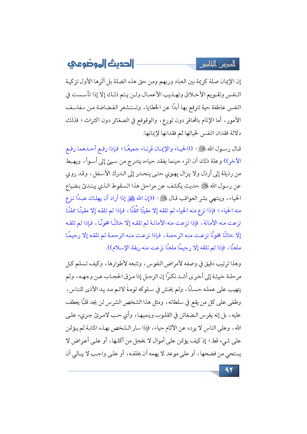 إن الإيمان صلة كريمة بين العباد وربهم ومن حق هذه الصلة بل أثرها الأول تزكية النفس وتقويم الأخلاق وتهذيب الأعمال ولن يتم ذلك إلا إذا تأسست في النفس عاطفة حية تترفع بها أبدًا عن الخطايا، وتستشعر الغضاضة من سفاسف الأمور، أما الإلمام بالمحاقر دون تورع، والوقوفع في الصغائر دون اكتراث؛ فذلك دلالة فقدان النفس لحيائها ثم فقدانها لإيمانها.